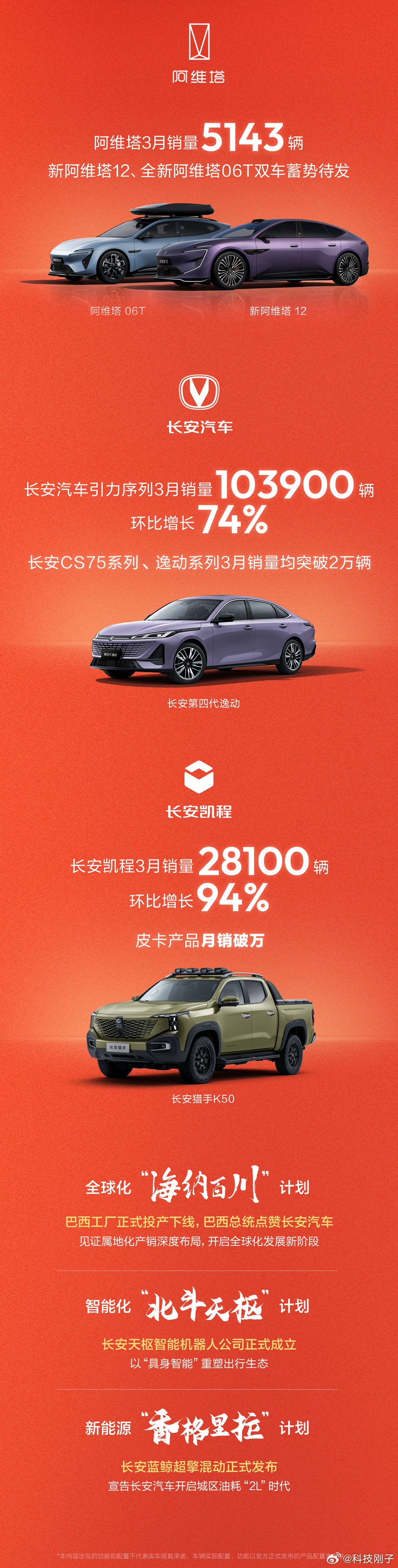 作为长安汽车、华为、宁德时代三方联合打造的高端智能电动品牌,阿维塔从诞生起就自带“顶级buff”,而在3月的市场表现中,它彻底把技术优势转化成了销量势能,完美诠释了“高端不高冷,实力见真章”。