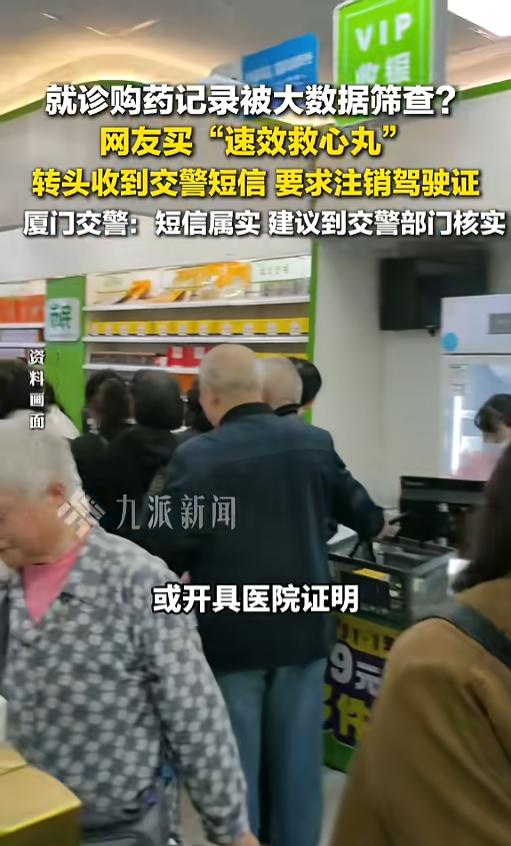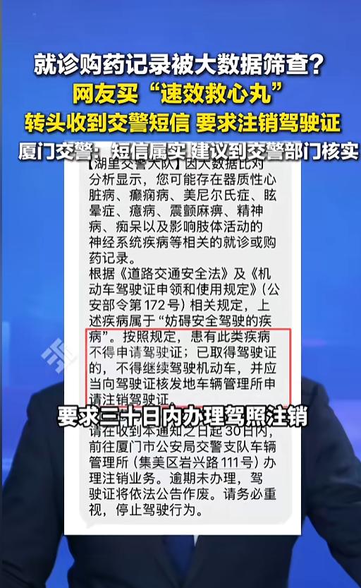 “买个药都不行?”近日,福建厦门,一网友购买速效救心丸后,竟然收到了交警部门的通知,对方要求他去注销驾驶证。通知说,大数据分析,他可能患有心脏病或其他精神类疾病,不符合取得驾驶证的条件。网友:这也太武断了吧! 最近一段时间,心源性猝死引发了社会的巨大关注,不少人看完之后,为了找点心理安慰,去买了点速效救心丸,没想到因此却惹上了麻烦。 据媒体3月31日报道,该网友就是这么个倒霉蛋。他刚买完速效救心丸,转头就被交警盯上了。交管部门发短信,让他30天内去相关部门注销驾驶证,理由也让他觉得离谱——大数据分析。 该网友就纳闷了,我就买个药备着,怎么就可能患病了?怎么就开不了车了?而且,为什么他们能看到自己的购药信息,这是不是侵犯隐私了? 事后,交警部门恢复,事情是真的,他们确实发过这样的短信。也不是非得注销,这只是一个提醒。如果本人没有患病,可以到交警部门签署承诺书,或者开具一个医院的证明。他们的本意,是预防此类疾病造成的驾驶风险。 网友看后表示,现在不少年轻人,都会给家里的老人买药,可能是心脏病、老年痴呆等,这样的也会被大数据记录,由此得出的结论是不是就失真了?不经调查,直接让驾驶员想办法证明,真的合适么? 信息来源:《就诊购药记录被大数据筛查?3月31日报道,买速效救心丸收到注销驾驶证短信 ,厦门交警:短信属实,建议到交警部门核实。》九派新闻