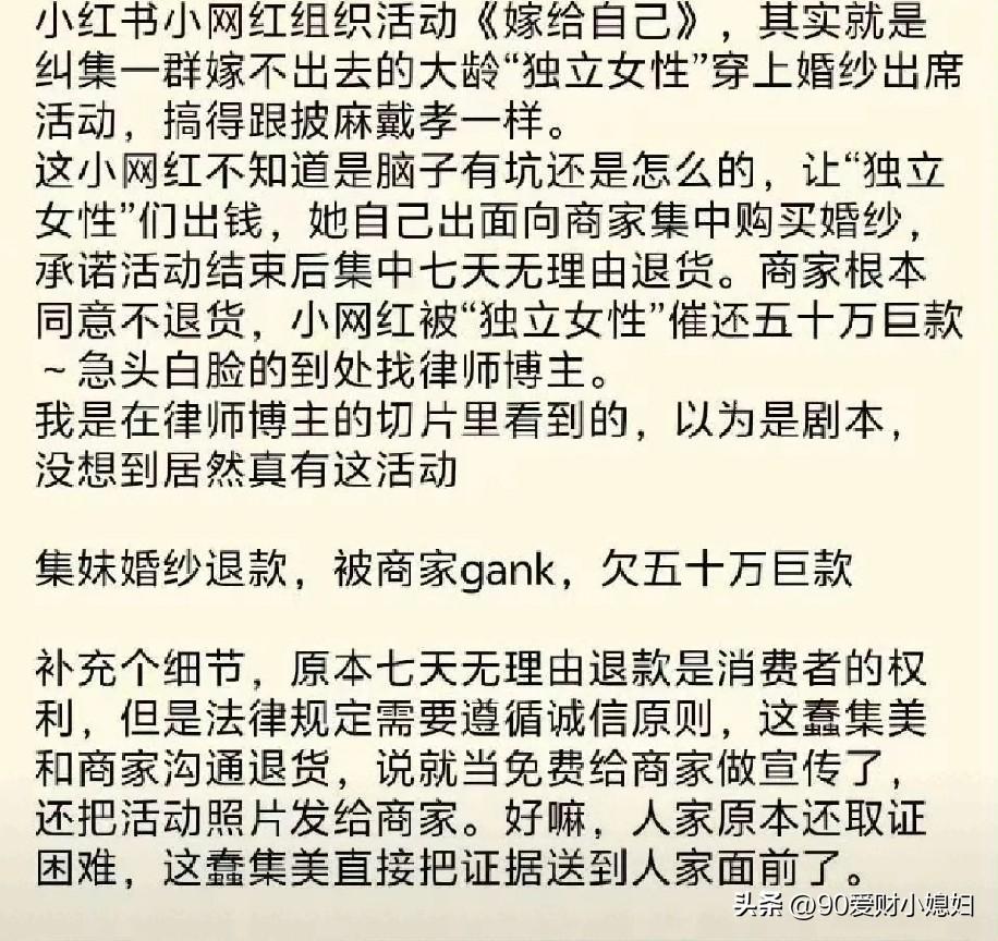 白嫖翻车了!某网红举办了一场主题《嫁给自己》的活动,还真有一群不婚主义的女性参加,被忽悠自己买婚纱,然后一群穿着婚纱的女人举办婚礼,结果婚纱退不出去了! 这个网红还觉得自己有名气,说是免费给婚纱店打广告,还自己把现场的照片发给店家,她还觉得自己做了好事,商家会对她感恩戴德的,同意她退款,结果商家不同意,这下证据也有了,网红直接欠50多万!这下玩脱了吧! 所以啊,人不要太高看自己,有点粉丝了就飘了,这也算是给她一个教训了,也不知道她举办这样的活动,是想宣传什么!