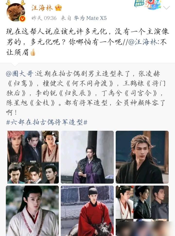 汪海林又开炮了,这次直接点名六位当红小生:“没一个像男的”。 这可不是他第一次放狠话。2018年9月,在第三届中国(宁波)影视编剧高峰论坛上,他当着全行业的面,把“大IP+小鲜肉”的公式,直接钉在了耻辱柱上。原话更狠:“我们娱乐圈已经鸭里鸭气了”,“有朝一日我要给鸭写戏”。他甚至呼吁,评选前先给男演员做“性别鉴定”。 作为中国电影文学学会副会长、业内资深编剧,汪海林的每一次发声,几乎都能掀起舆论巨浪。他1971年出生于江西南昌,1997年毕业于中央戏剧学院戏剧文学系,从业二十多年,经手过《铁齿铜牙纪晓岚3》《神医喜来乐》《楚汉传奇》《一起来看流星雨》等多部国民级剧集,是见证并参与了中国影视行业黄金年代的创作者。 他的批评,从来不是空穴来风的个人好恶,而是基于几十年创作经验,对行业生态、资本逻辑与审美导向的深度观察。 这次针对六位当红小生的言论,并非孤立事件,而是他长期批判“去雄性化”审美的延续。早在2018年的论坛上,他就直言不讳地指出,近五年来,网剧和电视剧里正常的男性形象基本缺位,大多数主角是流氓、胆小鬼,荧幕上充斥着被资本精心打造的、缺乏阳刚气质的“小鲜肉”。 他当时抛出的“大IP+小鲜肉=大SB”的公式,直指资本用流量数据取代创作实力、用流水线式的审美碾压多元表达的行业乱象。 时间快进到2026年3月下旬,汪海林的批评有了更具体的靶子。他先是在社交媒体上转发了网友对比演员何润东与张凌赫饰演将军形象的博文,并评论“古人弱冠之后都会蓄须,宦官除外”。 这句话迅速被解读为对张凌赫在新剧《逐玉》中“白净无须、妆容精致”将军形象的批评,“粉底液将军”的戏称由此传开。他紧接着发文,直指当下古装剧的“将军”形象问题,称这些角色涂脂抹粉、弱不禁风,打完仗脸上连灰都没有,更像是“移动的美妆广告”。 他进一步剖析,这并非个别演员或某部剧的问题,而是整个中国娱乐圈系统性、结构性的“去雄性化”。那些妆容比女明星还精致的男演员,垄断了市场80%以上的资源,古偶、仙侠、历史剧里通吃,演将军、演帝王、演硬汉,都保持着无死角的俊美。 反观他认识的那些有阳刚气质、适合塑造硬核男性角色的演员,这些年要么无戏可拍,要么被迫转型,市场几乎没有给他们生存空间。更让他感到讽刺的是,这些占据主流的演员,在享受完所有红利后,还擅长“委屈营销”,一旦被批评,就装弱势、博同情。 此次直接点名六位当红小生,是他对这一现象的集中爆发。他直言,这些被资本和流量捧上天的顶流,外形、气质、表演风格高度同质化,清一色的白皙、精致、柔美,缺乏男性应有的棱角、力量感与血性,在荧幕上呈现出一种病态的审美单一。 他的言论,精准戳中了许多观众的心声,不少网友纷纷附和,晒出过去经典影视剧中的男性角色形象,对比当下古偶剧里的“花美男”,感叹荧幕上的男性气质正在消失。 汪海林的批评,本质上是对资本逻辑的反抗。他曾坦言,自己的批评并非针对演员个人,而是出于对行业的恐惧与绝望。 在资本主导的市场里,创作逻辑被彻底抛弃,平台指定题材、掌控资金、垄断渠道,然后用流量数据去筛选演员,不需要演技、不需要个性、不需要符合角色气质,只要长得符合被精心计算过的“漂亮”标准,就能成为主角。这种闭环模式,批量生产出缺乏灵魂的角色和千篇一律的剧集,是对文化创作的“屠杀”。 他的言论也引发了巨大争议。支持方认为他敢说真话,点破了行业沉疴,呼吁回归演技与作品本身,拯救日渐畸形的审美。 反对方则认为他言辞过激、思想保守,甚至有“厌女”倾向,认为审美本应多元,不应以单一标准定义男性气质。双方的争论,早已超出了对几位演员的评价,演变为一场关于行业规则、创作自由与大众审美的深度辩论。 面对争议,汪海林始终立场坚定。他澄清自己对张凌赫等演员并无个人恩怨,甚至“不认识”他们,批评的是现象而非个人。 他强调,公鸡就该有公鸡的样子,一个健康的影视行业,应该允许并呈现多元的男性形象,既可以有铁血硬汉,也可以有温润君子,但绝不能被一种单一、柔弱、商品化的审美所垄断。他甚至表示,自己愿意为那些被市场忽视的、有真正男性气质的演员写戏,用作品去对抗这种不良风气。 从2018年的论坛炮轰,到2026年的集中点名,近十年间,汪海林从未停止对行业乱象的批评。他就像一个固执的守夜人,用犀利甚至刺耳的声音,不断提醒着行业回归创作初心,警惕资本对文化的侵蚀。 他的言论或许刺耳,却真实反映了一部分从业者与观众的心声。这场由他引发的争论,还将持续下去,而荧幕上男性形象的未来走向,也终将在这场持续的讨论与博弈中,慢慢找到新的方向。