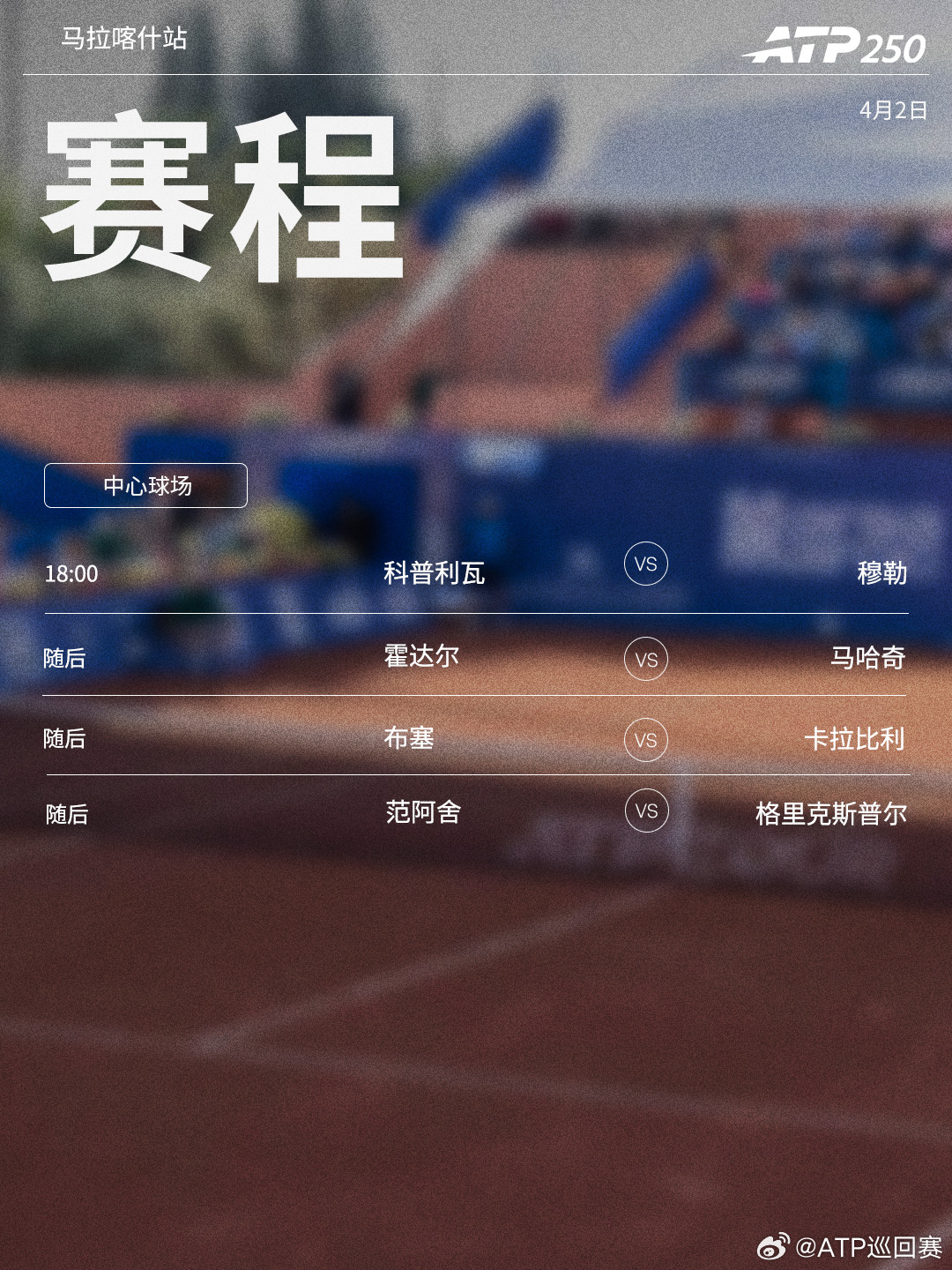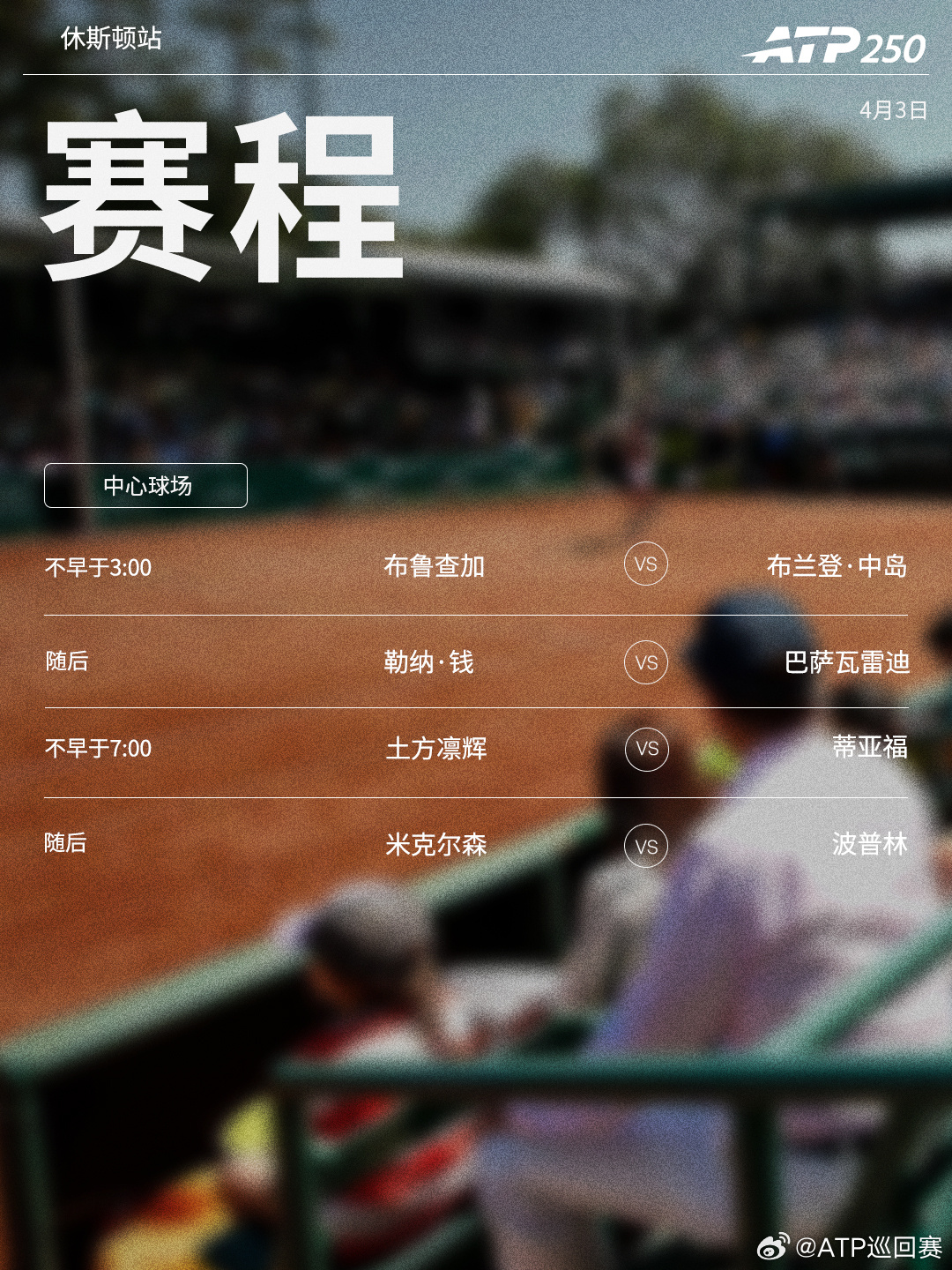 三站ATP250红土赛事周四将继续第二轮的争夺,赛程见图(均为北京时间)👀