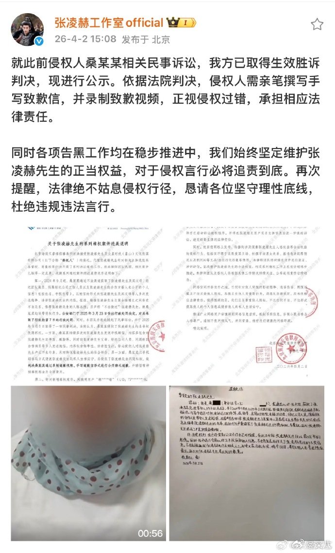 张凌赫工作室发黑粉手写道歉信张凌赫告桑某某侵权胜诉 张凌赫告桑某某侵权胜诉,还发