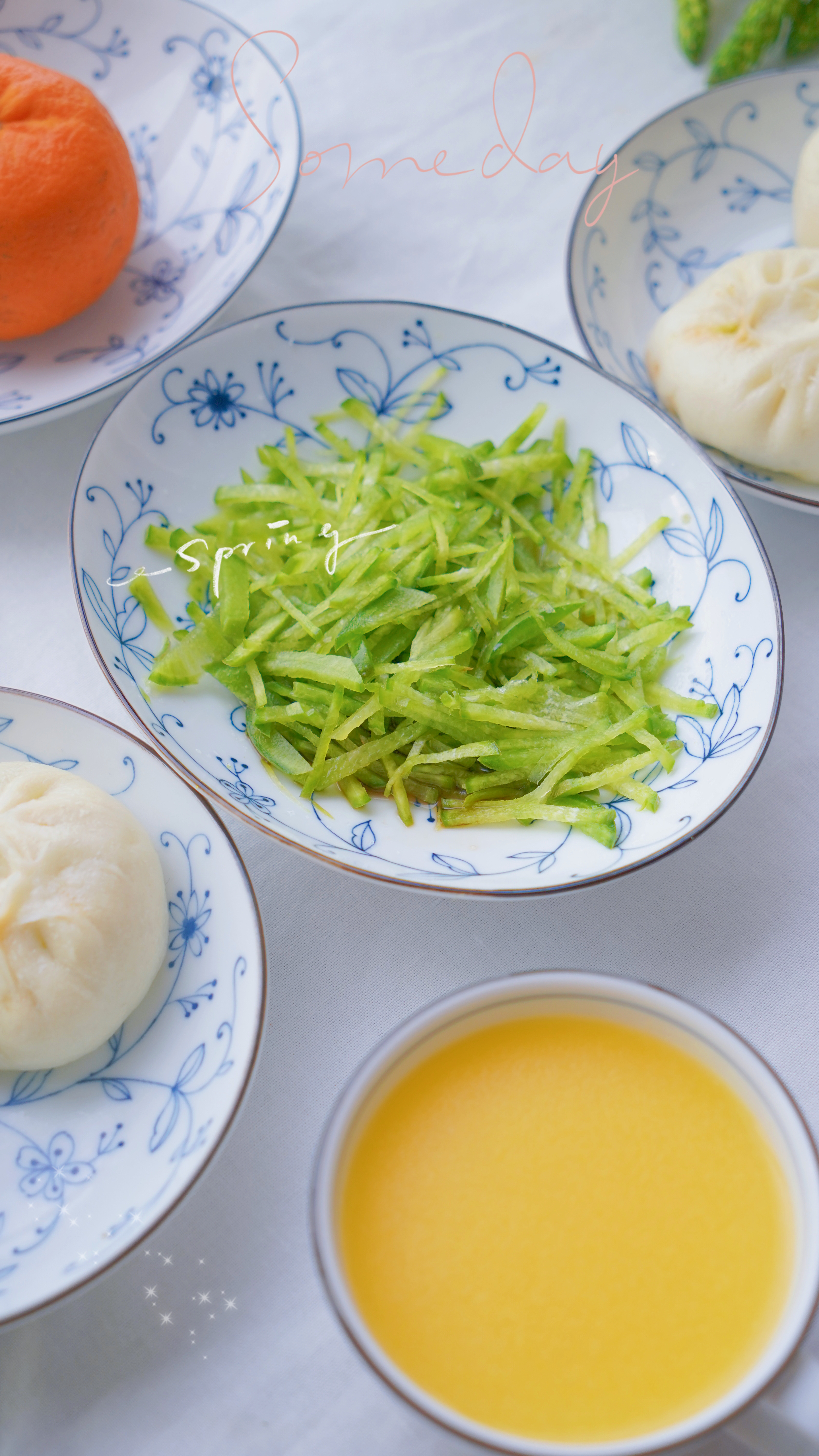 今日早餐:韭菜素包子、玉米汁、凉拌青萝卜丝,还有一颗甜橙🍊。