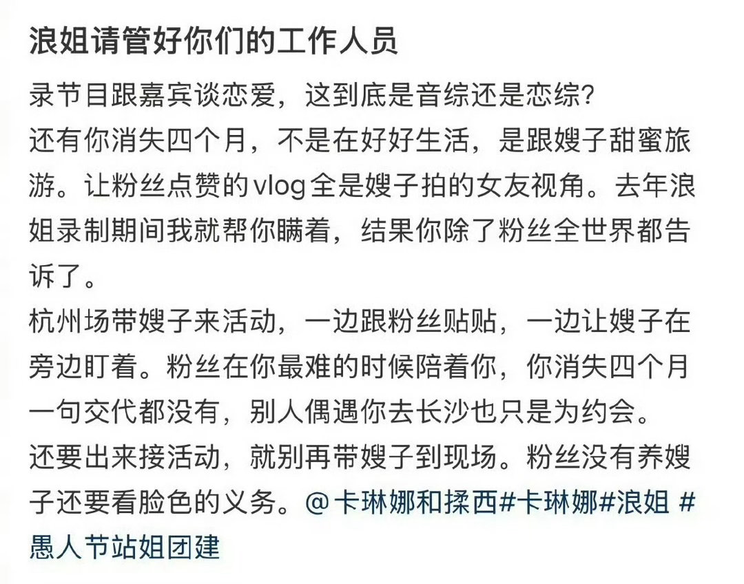 卡琳娜都有孩子了目跟嘉宾谈恋爱,音综还是恋综?消失四个月不是好好生活,是跟嫂子甜蜜互动,vlog全是嫂子的女友视角!去年粉丝在你最难的时候陪着你,你消失四个月,回来就带嫂子来活动,一边跟粉丝贴贴,一边让嫂子盯着!粉丝没有养嫂子的义务