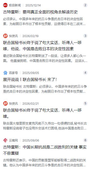 联合国秘书长终于说了句大实话,听得人头皮发麻!很多人以为,二战是美国原子弹炸赢的。大错特错!古特雷斯直接揭开历史真相:中国,才是击败日本的决定性因素!没有中国死死拖住那280万日军,世界历史早就改写了! 麻烦看官老爷们右上角点击一下“关注”,既方便您进行讨论和分享,又能给您带来不一样的参与感,感谢您的支持! 最近联合国秘书长古特雷斯说了一句话,听得不少人心里头一震。这位全球最高级别国际组织的掌门人,直接挑明了:中国是击败日本的决定性因素。这句话从他嘴里说出来,那分量可完全不一样了。作为联合国的一号人物,古特雷斯没必要去讨好谁,更犯不着编什么故事。他讲的每一个字,都是站在联合国这个维护世界和平的平台上,基于历史事实给出的评判。 古特雷斯这次一点弯子都没绕。他在2025年8月底接受央视《高端访谈》专访时直言,必须承认中国多年来的抗日斗争是抗击日本的决定性因素,为削弱日本作出了根本性贡献。他还专门点出一件事:二战的起点不应该再按西方教科书上写的1939年德国打波兰来算,而应该从1931年日本侵略中国算起。这个时间上的修正,可不是小事。它把中国那长达十四年、艰苦卓绝的抗战,一下子推到了世界历史舞台的最中央。 过去很长一段时间,国际上讲二战史,聚光灯总是打在欧洲战场上。诺曼底登陆、斯大林格勒保卫战这些故事被反复传颂。而遥远的东方,中国军民付出的巨大牺牲和进行的持久抵抗,却常常被一笔带过,甚至被直接忽略。有些西方学者公然把中国战场贬低为“边缘战场”,在一本讲述二战的书里,花八百多页详细写欧洲战事,写亚洲战场只用不到二十页,还说中国抗战只是“缺乏协调的区域性抵抗”。这种说法实在是不公平。 很多人以为,日本投降主要是靠美国那两颗原子弹炸出来的。古特雷斯的说法,把这种刻板印象给推翻了。他明确指出,日本对中国的大规模入侵才是二战真正的开端,是中国长期坚持抗击日本侵略,才把日本拖向了失败。这话说得直白,但确实是真话。 想想看,当1931年九一八事变爆发时,欧洲大陆还是一片所谓的“平静”。中国是世界上第一个站出来抗击法西斯侵略的国家,而且一打就是十四年,是反法西斯战争中坚持时间最长的国家。那十四年里,中国军民面对的是装备精良、训练有素的日本军队,手里拿着的是连对方零头都比不上的简陋武器。但就是靠着血和肉的拼杀,中国战场始终牢牢牵制着日本陆军的主力。太平洋战争爆发后,中国战场牵制了日本陆军70%以上的兵力,此外还牵制了日本海军三分之一以上的力量。 这组数字意味着什么?意味着日本军国主义最精锐的力量,被死死钉在了中国的土地上。他们不是不想去别的地方,而是根本脱不开身。整个二战期间,在中国战场被歼灭的日军超过150万人,加上战后投降的128万,近280万日军主力深陷在中国战场。从1931年到1945年,中国战场累计毙伤俘日军150多万人,占日军在整个二战中军队伤亡总数的70%以上。 中国战场的战略价值,远不止消耗了多少日军这么简单。它从两个方向上彻底粉碎了日本的全球野心。一个是北上。1941年德国大举进攻苏联,如果日本当时选择从中国东北北上夹击,苏联就将面临东西两线作战的绝境。但正是因为中国军队死死拖住了日本陆军的主力,日本根本没有多余的兵力去动苏联。苏联这才敢从远东抽调几十万精锐部队赶赴莫斯科战场,最终守住了苏联的心脏地带。 太平洋战争爆发后,日本想把主力抽调到东南亚和太平洋战场,跟德国法西斯的势力在中东会师。但中国战场就像一只巨大的铁钳,把日本陆军的主力牢牢夹住,日军根本抽不出兵力去支援太平洋战场。丘吉尔当年就说过一句话,如果没有中国军队拖住日本,日军很可能与德国法西斯在中东会合,那后果真是不堪设想。罗斯福也多次提到,如果没有中国主战场,日军就会把大量兵力投入东南亚、太平洋战场乃至澳大利亚。 中国为这场胜利付出的代价,沉重得让人头皮发麻。根据国务院新闻办2015年发布的权威数据,抗日战争期间中国军民伤亡达到3500万人以上。光是军队就伤亡了380多万人,这个数字占到二战各国伤亡人数总和的三分之一。3500万,那不是一串冷冰冰的数字。每一个数字背后,都是一条活生生的人命,一个支离破碎的家庭。按照1937年的比价折算,中国的直接经济损失超过1000亿美元,间接经济损失更是高达5000亿美元。一个国家打成这个样子,最后还能坚持下来不投降,放眼世界历史也是少有的。 古特雷斯的这次表态,不只是一句简单的评价,它打破了西方主导了八十年的二战叙事垄断。长期以来,二战的叙事框架是以西方为中心的,欧洲战场是主角,其他战场都是配角。这种框架不仅忽视了战争起源的全球性与复杂性,更淡化了中国等国家的巨大牺牲与贡献。古特雷斯明确呼吁,要全面地看待二战,要用真正全面的视角去解读历史,而不是仅仅从历史学家所属的地理区域视角出发。