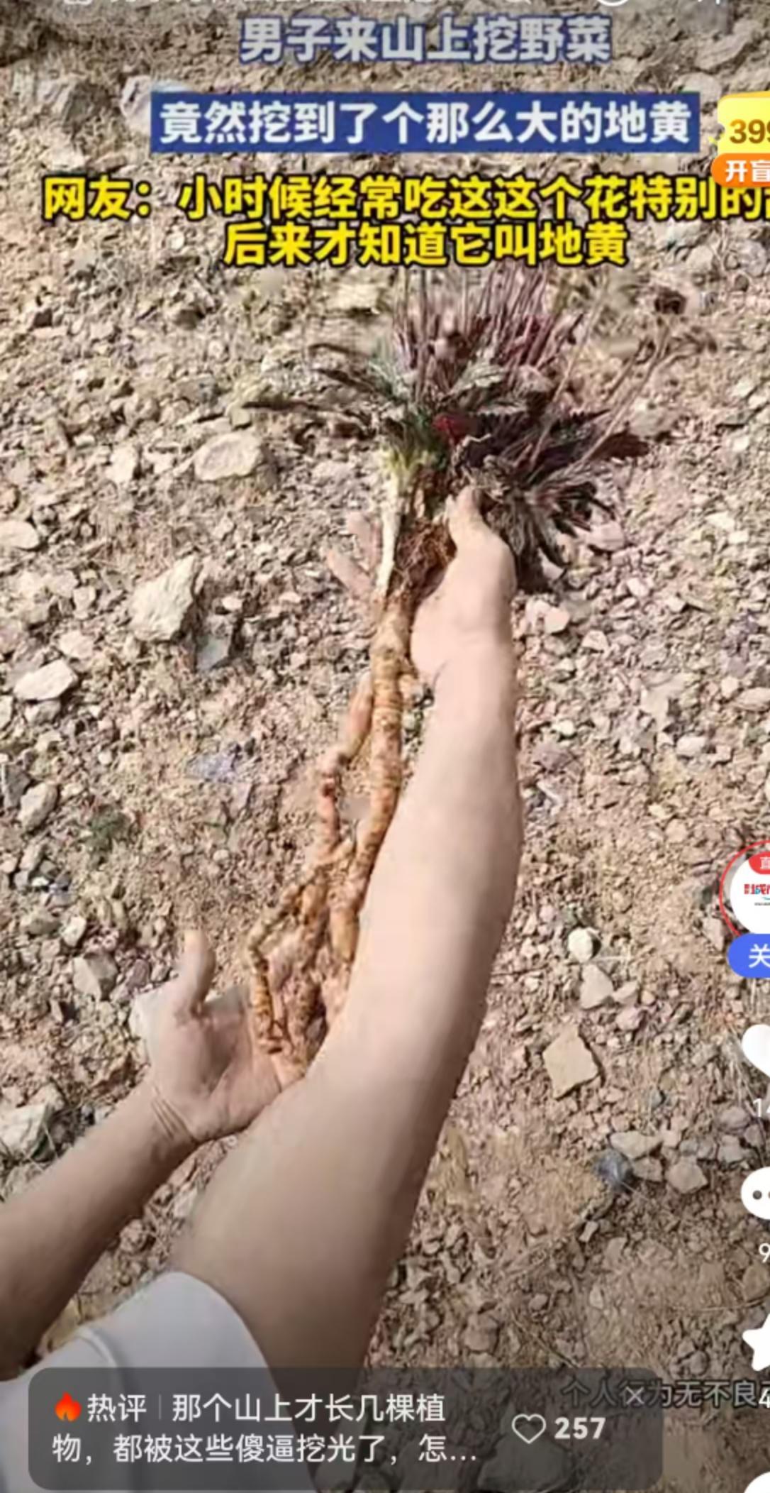 一锄头下去本指望挖点鲜嫩荠菜包顿饺子,泥土翻开的瞬间,露出来的却是一根小臂粗的庞然大物。近日一位男子上山挖野菜的意外收获,直接把一株长得离谱的“地黄王”送上了热搜。画面里这株地黄根茎异常粗壮,盘根错节的形态跟寻常中药材铺子里见到的切片截然不同,视觉冲击力拉满。 这株变异级别的大地黄,像一把钥匙瞬间打开了无数人的童年记忆闸门。河北一位网友的留言道出了大部队的心声:“小时候没少吸花吃,原来这东西就是地黄呀。”这种体验极具时代共鸣。几十年前的乡村田野,没有琳琅满目的零食,小孩子满山跑,揪下地黄那串筒状的花朵,放在嘴里猛吸一口,底部会带出一丝清甜的汁水。那时候满地乱爬的野草,在长辈嘴里往往就是能治病的土方子,正如上海网友所感慨的,曾经遍地都是的野草,如今都带上了中药的属性。 地黄在传统医药里的地位确实硬核,大名鼎鼎的六味地黄丸里它稳坐C位。鲜地黄清热生津,干地黄滋阴清热,经过九蒸九晒炮制后的熟地黄更是补血滋阴的重器。这也就不难解释,为何男子挖出的这株“地黄王”能引发如此高的热度。在大众认知里,野生药材年份越久、个头越大,沉淀的“药效”似乎就越浓郁,这种对野生天然的崇拜心理根深蒂固。 狂欢之中,甘肃一位网友的冷眼旁观扯下了这层浪漫滤镜。一条关于“专家表示野生地黄不适合入药,可能生长在受污染环境中”的留言,把话题从童年怀旧硬生生拽回了现实安全层面。这种担忧绝非杞人忧天。野生植物没有生长环境筛选权,它们扎根的土壤若是曾经堆放过工业废渣,或者长期受到重金属废水渗透,植物根系在疯狂吸收水分养料的同时,会把土壤里的有害物质一并富集。那些看着粗壮水灵的根茎,内部极可能藏着农残或重金属超标的隐患。 这其实点出了一个极具实用价值的信息盲区:野生绝不等于安全,个大更不等于药好。正规中药材的种植有着严格的土壤检测、农药规范和重金属限量标准,上市前必须经过层层抽检。反观野外随意挖出的植物,肉眼根本无法判断其生长环境的底细。把不知底细的野生植物当补品泡水熬汤,等于把身体健康交给了未知的运气。 回看这场由“地黄王”引发的讨论,它精准投射出了当下公众面对自然馈赠时的矛盾心理。一面是对童年纯净岁月的深深怀念,一面是对现代生态环境隐性风险的防备不安。春日里去山野间踏青挖菜,享受的是远离喧嚣的野趣与放松,切莫把这种休闲活动异化成盲目寻宝。认清楚野菜的边界,管住想尝鲜的嘴,把那些粗壮的野生块茎留在它们原本的土壤里,或许才是对自然、对健康最理智的尊重。 以上内容仅供参考和借鉴