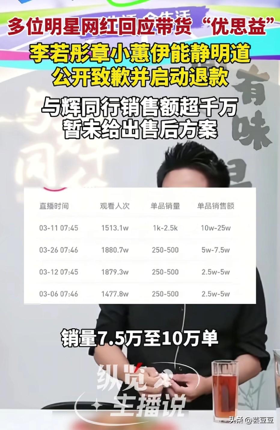 多位明星集体翻车,这回可被现实狠狠打脸! 目前三位女星因带货澳洲进口“优思益”已公开道歉并退款。 只有与辉同行还未作出解释。之前号称百万投入、层层审核、严选验厂的光环,在央视调查面前碎了一地。连央视一查就穿帮的假洋牌,专业选品团队竟毫无察觉? 千万销售额背后,是几万普通人掏真心、冲诚信靠谱下的单。信任一旦塌了,再想捡起来,估计比登天还难。 能不能守住口碑、守住初心,就看接下来敢不敢担当、肯不肯真赔钱、真道歉了。 就连明星和诚信靠谱的人都不能相信,你们说以后还能相信谁?