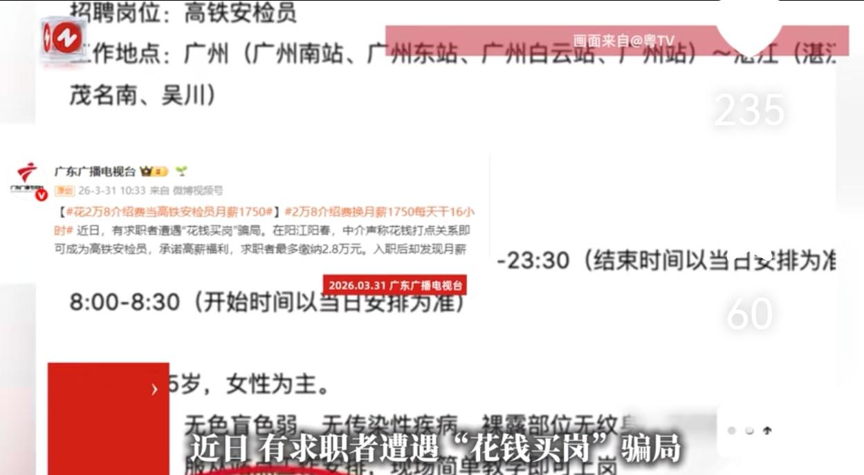 河南,女子花28000元买了一个“高铁安检员”内部名额,上岗后才知:月薪仅1750元,每天站16小时,不吃不喝要16个月才回本。中介说,成交了就有服务费,坚决不退钱。报警不立案。 在她眼里,高铁相关工作就是体面、稳定的代名词,哪怕花点钱,只要能端上“铁饭碗”,后期也能轻松回本。可她万万没想到,这笔看似“划算”的投资,最后变成了一场让她追悔莫及的骗局。 中介当初跟她说得特别好听,一口一个“内部指标”,说这份工作是高铁正式相关岗位,风吹不着雨淋不着,穿上制服特别有面儿。 还拍着胸脯保证,工资待遇高、福利好,28000块钱的服务费不算啥,用不了几个月就能挣回来,以后一辈子都能有稳定收入,比打零工、进小工厂强太多。 女子被说得动了心,犹豫了几天,还特意跑到高铁站去看,看着那些穿着制服的安检员,在干净整洁的车站里工作,更觉得这笔钱花得值。 她没再多想,当即就给中介转了28000块钱,就等着中介安排上岗,开启自己的“体面工作”。 可刚一开始培训,女子就觉得不对劲。正规的高铁安检培训,流程规范、要求严格,可她参加的培训,敷衍得不能再敷衍,就简单教了几句基本流程,连正经的实操训练都没有。 那时候她心里就犯了嘀咕,但想着钱已经花了,再等等看,说不定上岗后会不一样。 等到正式上岗,女子彻底傻了眼。中介承诺的“轻松体面”,压根就是天方夜谭。 她每天早上6点就得到岗,一直工作到晚上10点才能下班,一天整整16个小时,全程都得站着,连坐下来歇一会儿的时间都没有。吃饭更是赶时间,只有40分钟,大家都是狼吞虎咽吃完,就赶紧回到岗位上,生怕耽误工作。 一天下来,她的腰和腿都麻得受不了,浑身酸痛,连走路都费劲。可最让她崩溃的,还是第一个月发工资的时候。手机短信提示到账1750块钱,她反复看了好几遍,确认没看错,心一下子就凉透了。 她算了一笔简单的账,28000块钱的服务费,每个月挣1750块,不算房租、生活费,不吃不喝不花一分钱,得整整干16个月才能把本钱挣回来。 可她每天要站16个小时,干的是最累的活,拿的却是连当地最低工资都达不到的工资——按照国家规定,河南的最低工资标准早就超过1900块了,她这1750块钱,本身就不符合法律规定。 更过分的是,按照劳动法要求,每天工作时间不能超过8小时,就算要加班,每天也不能超过3小时,每个月加班总时长不能超过36小时。 可她每天工作16小时,相当于一天就加班8小时,远远超出了法律规定,中介和用工方却连一句解释都没有,更别说支付加班费了。 女子越想越觉得上当,赶紧找中介要求退钱。可中介立马变了脸,语气强硬得很,说只要成交了,服务费就不退,不管她工作好不好、工资高不高,还说当初是她自己愿意买名额,怨不得别人。 不管女子怎么理论、怎么求情,中介都油盐不进,到最后甚至不回消息、不接电话。 走投无路之下,女子只能选择报警,希望警方能帮她追回被骗的钱,惩治黑心中介。可让她没想到的是,警方看完她的材料后,说没法立案。 后来她才弄明白,中介早就钻了法律的空子,当初签的合同只写了“就业服务”,压根没提当初承诺的“高工资”“正式名额”,那些口头承诺,没有任何书面证据,很难认定是诈骗。 这种“花钱买工作”的骗局,其实并不是个例。河南杞县就有过类似的事,有人花几万块托人找高速公路收费员、辅警的工作,最后钱被骗了,工作也没影。 这些中介就是抓住大家想找稳定、体面工作的心理,编瞎话骗钱,用“内部名额”“百分百上岗”当噱头,等钱到手,就翻脸不认人。 而且这些中介特别狡猾,会用书面合同包装自己的诈骗行为,合同里全是免责条款,把非法诈骗伪装成合法的服务,让警方很难认定是刑事犯罪,最后只能归为民事纠纷。 受害者想要维权,要么没有证据,要么耗时耗力去法院起诉,最后大多只能认栽。 其实稍微打听一下就知道,河南这边正规的高铁安检员,哪怕是劳务派遣,月薪也得3000块以上,试用期都有2300多,还会有加班费、餐补,工作时间大多是上二休二,每天最多工作12小时,根本不可能像女子这样,月薪1750还每天站16小时。 说到底,哪有什么“内部名额”可言。不管是高铁安检员,还是其他稳定工作,正规招聘都是公开透明的,不需要花几万块钱买。 那些声称能“花钱找工作”的中介,全都是骗子,他们只想着赚你的服务费,根本不会管你能不能找到合适的工作。 希望这件事能给大家提个醒,找工作千万别贪捷径,别相信中介的花言巧语。一定要擦亮眼睛,正规工作只能通过官方渠道招聘,只要让你先交高额服务费、打点费的,全都是骗局。不然到最后,钱被骗了,还得干最苦最累的活,维权都无门,真的太不值了。