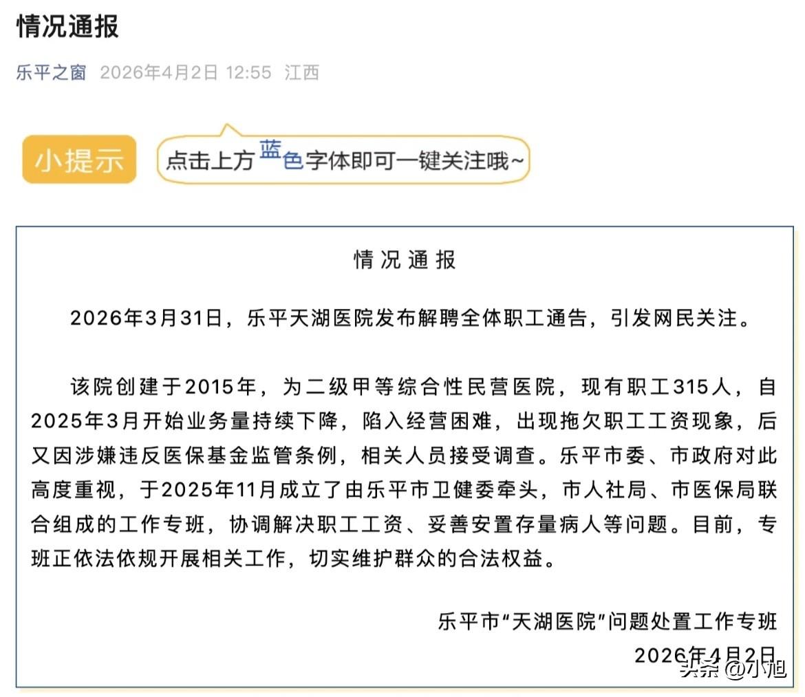 2026年3月31日,江西乐平天湖医院一纸通告扔出来,315个职工,一个不留,全部解聘。