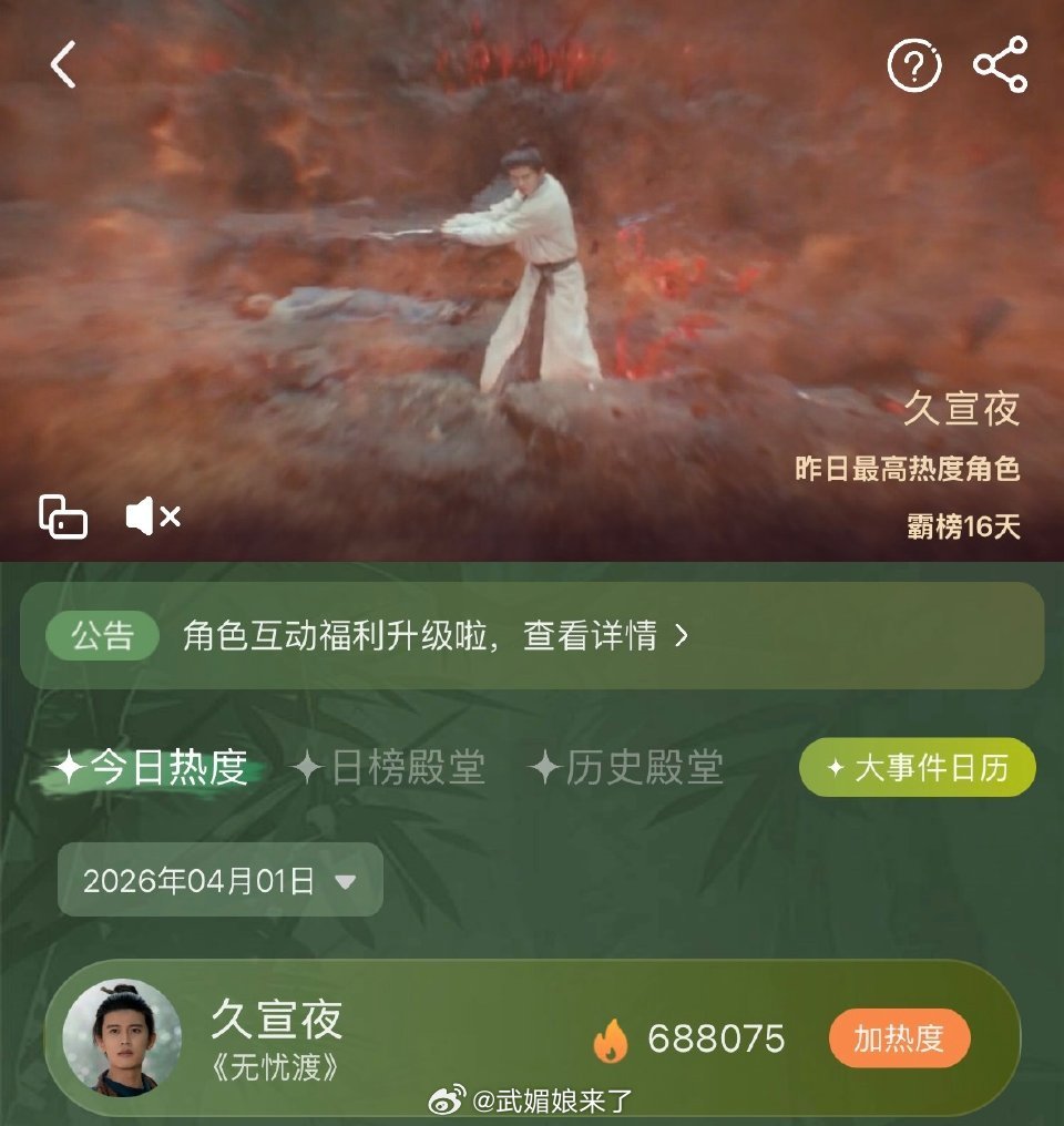 太牛了哇!25年的4月12日播出的剧!26年4月1日我们久宣夜角色热度再登日榜top1