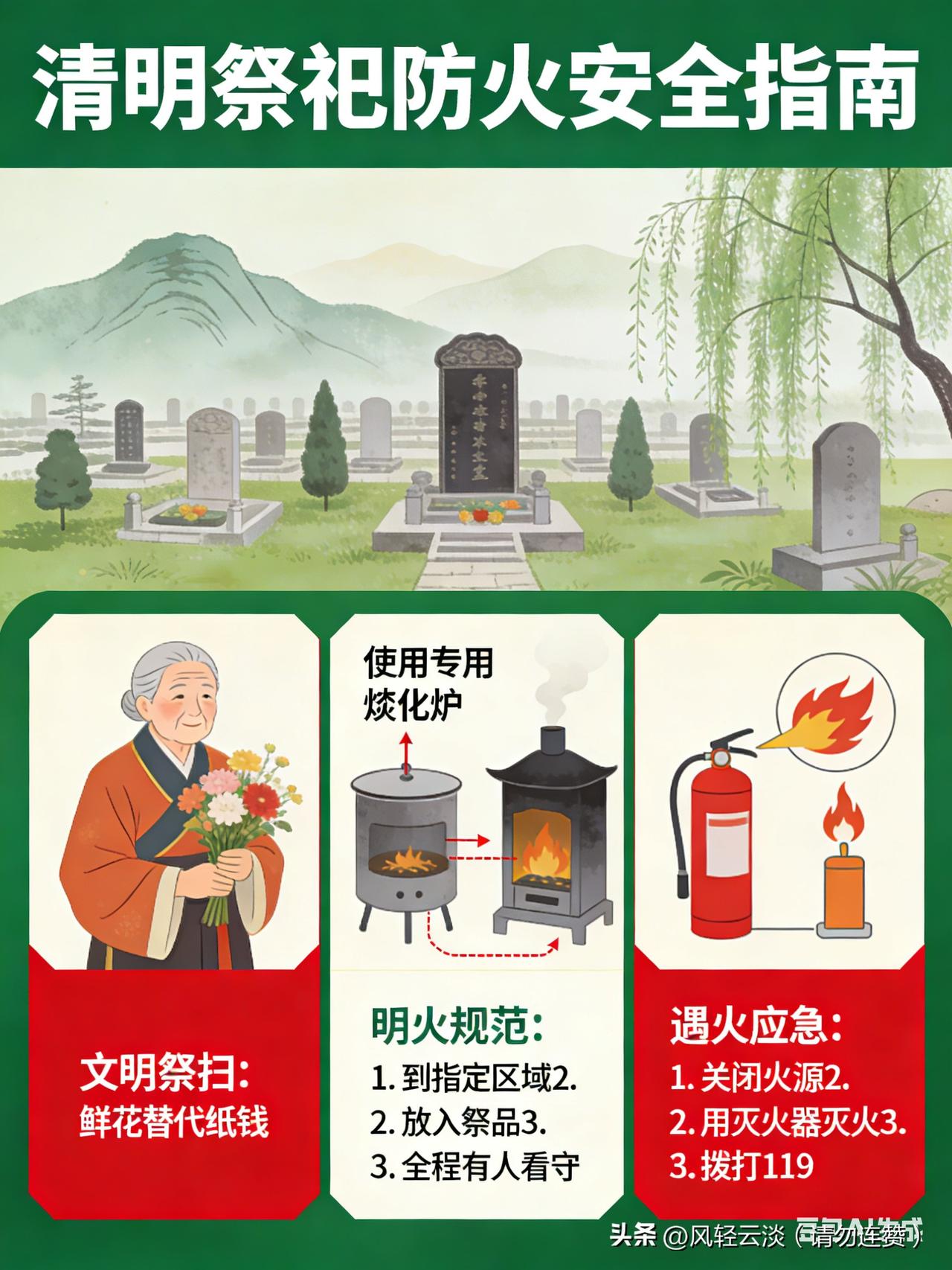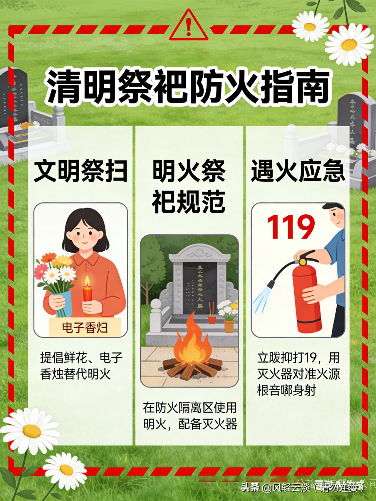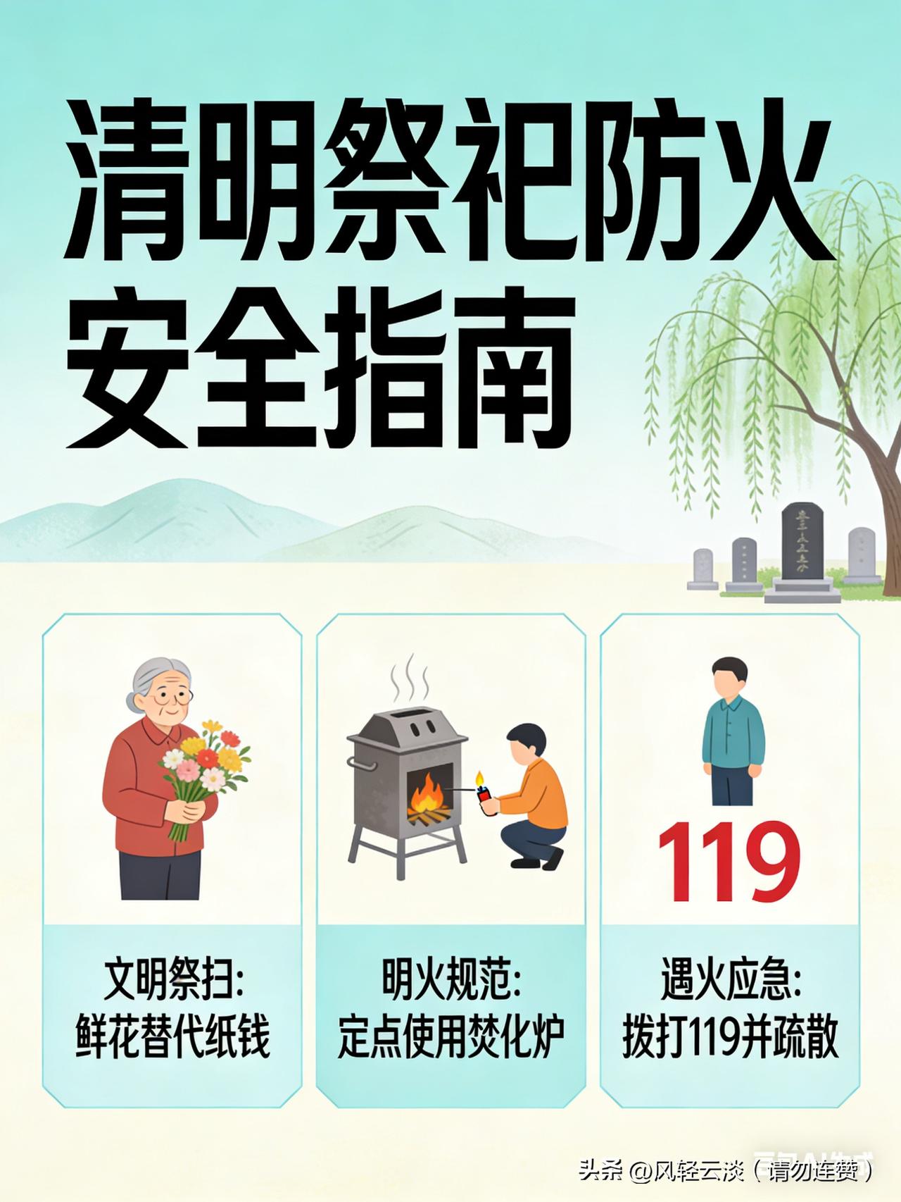 🔥 清明祭祀防火核心要点(必看) 一、优先选文明祭扫(最安全) - 用鲜花、植树、网络祭扫、踏青遥祭替代烧纸、焚香、放鞭炮 - 林区、防火区严禁一切明火祭祀 二、若用明火,严格遵守“四不” - 不违规:不在林区、草地、楼道、燃气管道旁、文物区用火 - 不离人:点烛、烧纸必须专人看守,人走火灭 - 不侥幸:先清理周边枯草、落叶、树枝等易燃物 - 不残留:结束后用水浇、土埋,确认无火星再离开 三、野外/林区“七个严禁”(官方规定) 1. 严禁携带火种、易燃易爆品进山 2. 严禁焚烧纸钱、焚香点烛、放烟花 3. 严禁野炊、烧烤、生火取暖 4. 严禁烧荒、烧秸秆、烧田埂 5. 严禁野外吸烟、乱扔烟头 6. 严禁狩猎放火驱兽 7. 严禁违规动火作业 四、家庭祭祀防火 - 纸钱放铁桶/金属盆内燃烧,远离窗帘、家具 - 香烛远离可燃物,睡前/离家前彻底熄灭 - 阳台、楼道不堆杂物,保持通道畅通 五、遇火应急 - 立即拨打119,说清地点、火势 - 逆风逃生,用湿毛巾捂口鼻,低姿撤离 - 不盲目扑火,优先保人身安全 六、法律后果 - 违规用火引发火灾,涉嫌失火罪,可处3年以下/3—7年有期徒刑