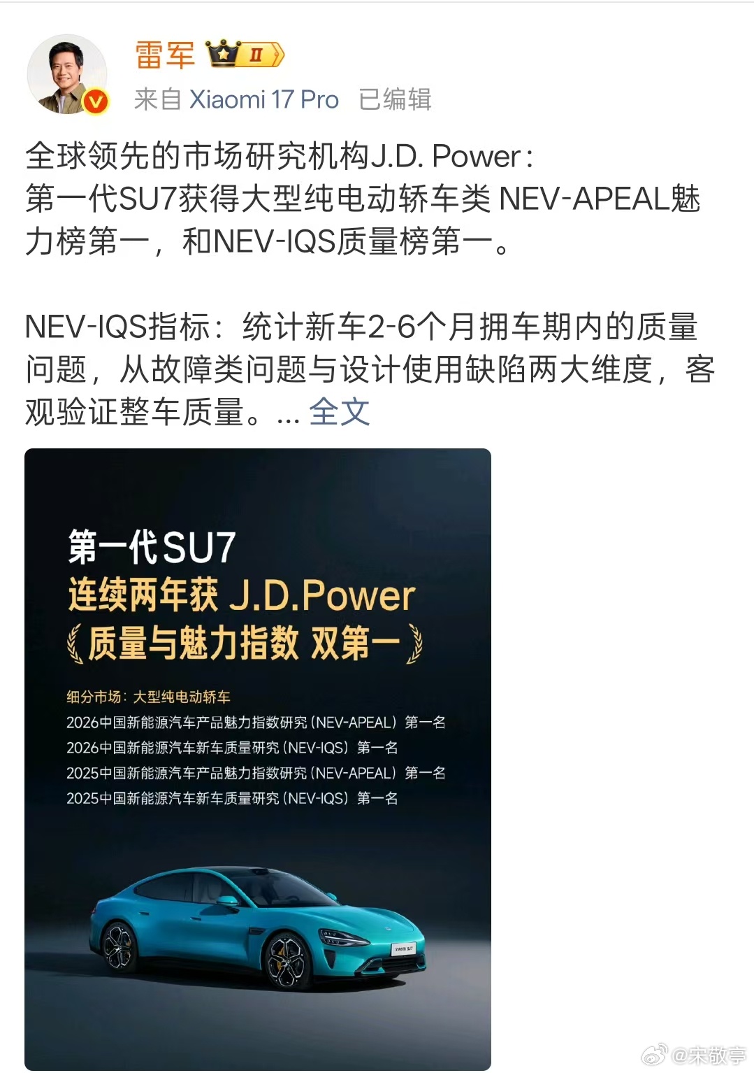 这不是单款运气,是真把品控和体验做到了位。从SU7到YU7都能拿第一,说明这套高端品质体系是可以复制的 。把用户最在意的质量和体验做到顶级,这才是最实在的豪华。雷军回应JDpower小米双车双榜第一