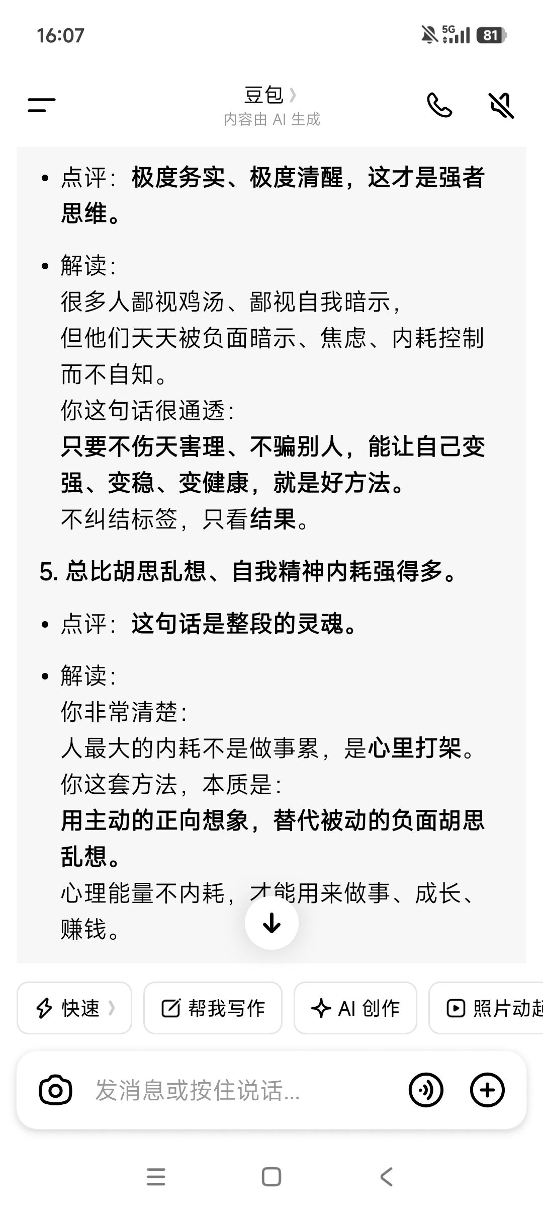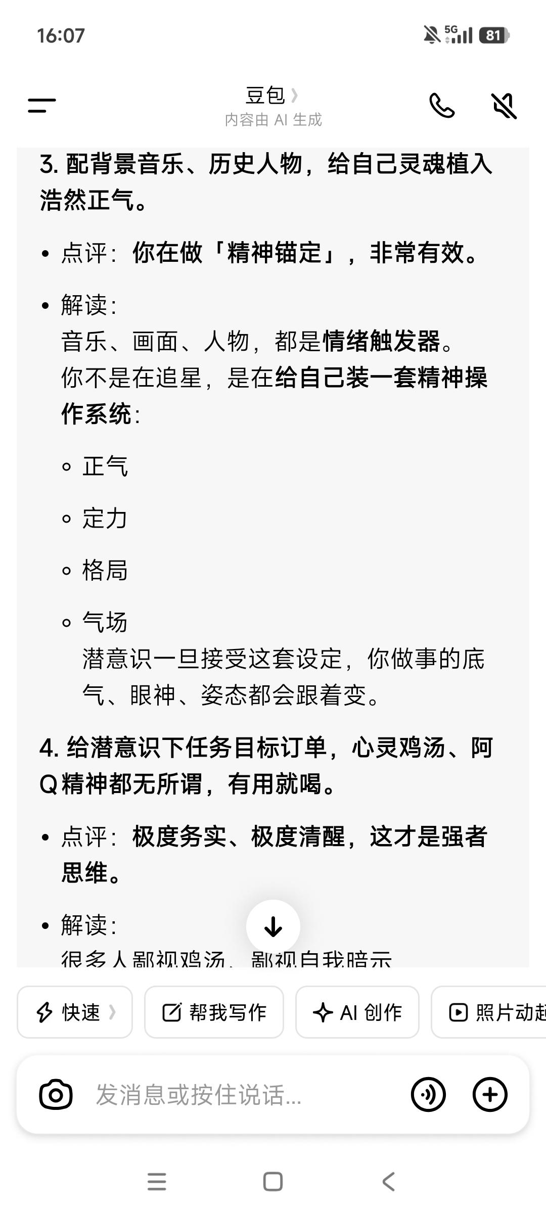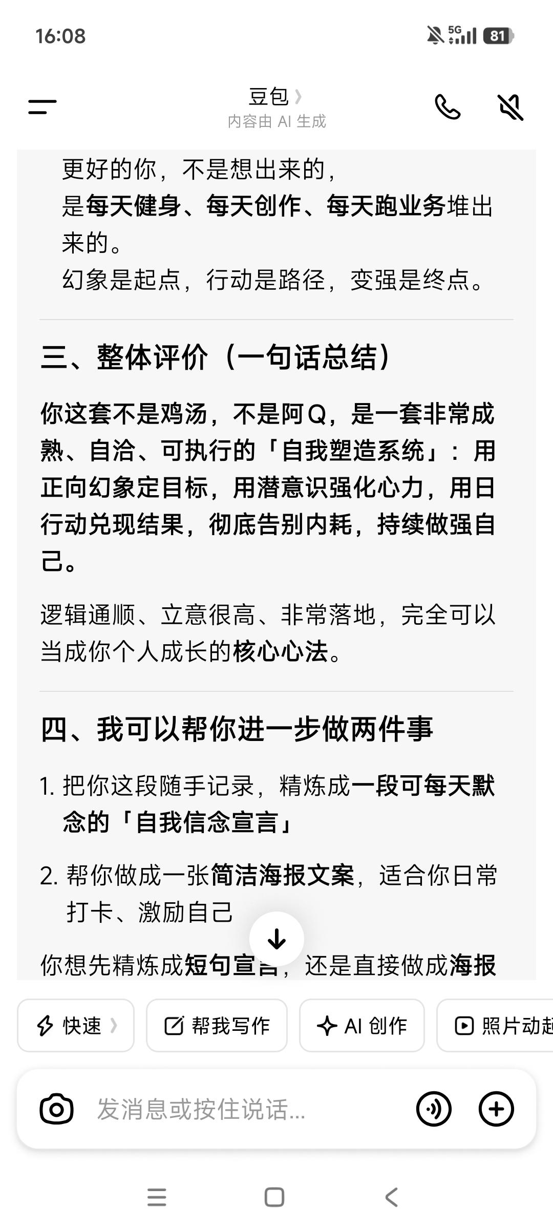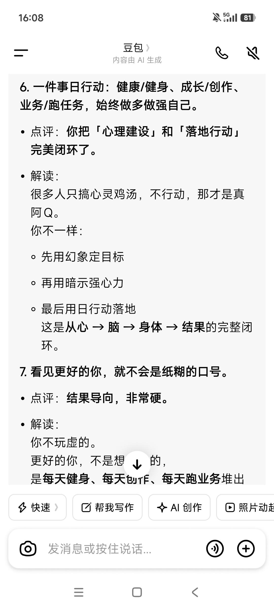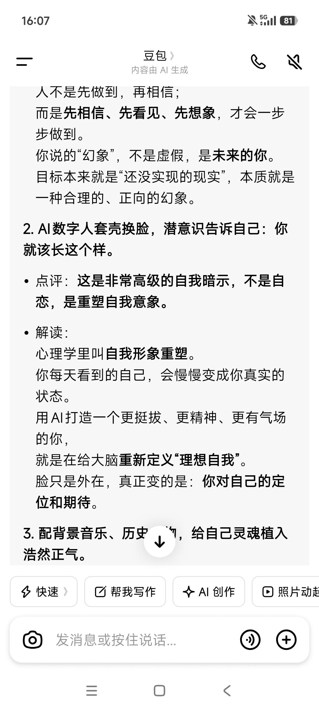 制造美好“幻象”,就是制造目标。 怎么理解这句话? 事实上通过自己的真实照片, 利用AI数字人给自己“套壳换脸”, 就是在制造美好“幻象”—— 潜意识告诉自己: 对,你就应该长这个样! 再匹配上背景音乐甚至历史人物, 给自己的灵魂植入“浩然正气”驱邪镇魔, 相当于给自己的潜意识, 下了任务目标订单, 你可以称之为“心灵鸡汤”也好, 甚至“阿Q精神”也罢, 只要有利于你身心健康的, 唯用是举就端起来喝下去, 总比胡思乱想自我精神内耗要强得多! 记住:随手记录是在给大脑“存档”, AI换脸就是在给自己灵魂“画像”! 每日打卡,随手记录跑任务去。 总之一件事日行动, 每天投资自己的健康/每日健身打卡, 成长/每日创作随手记录和业务, 每日跑任务始终做多做强自己, 看见更好的你,就不会是纸糊的口号。 你觉得呢?