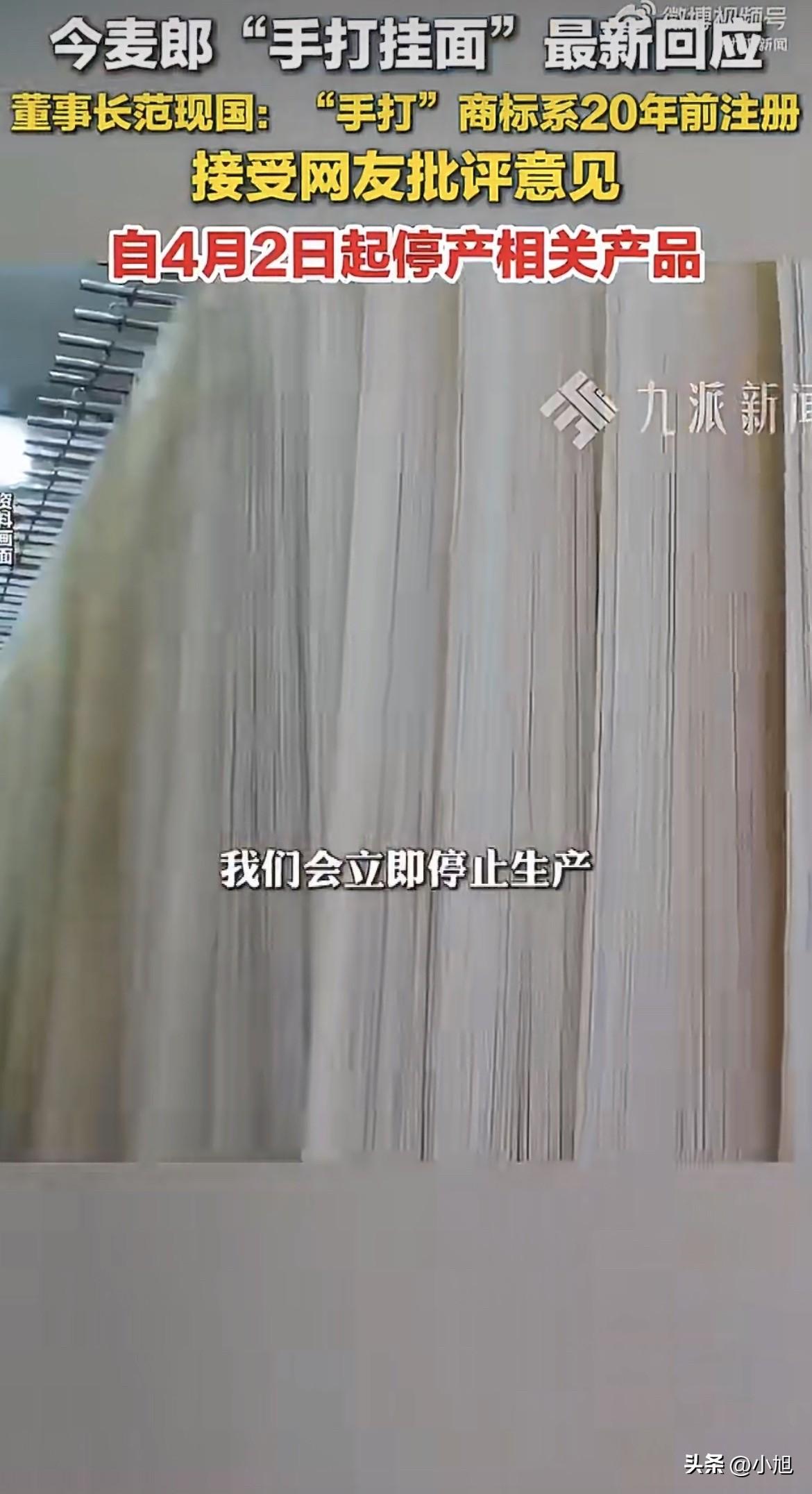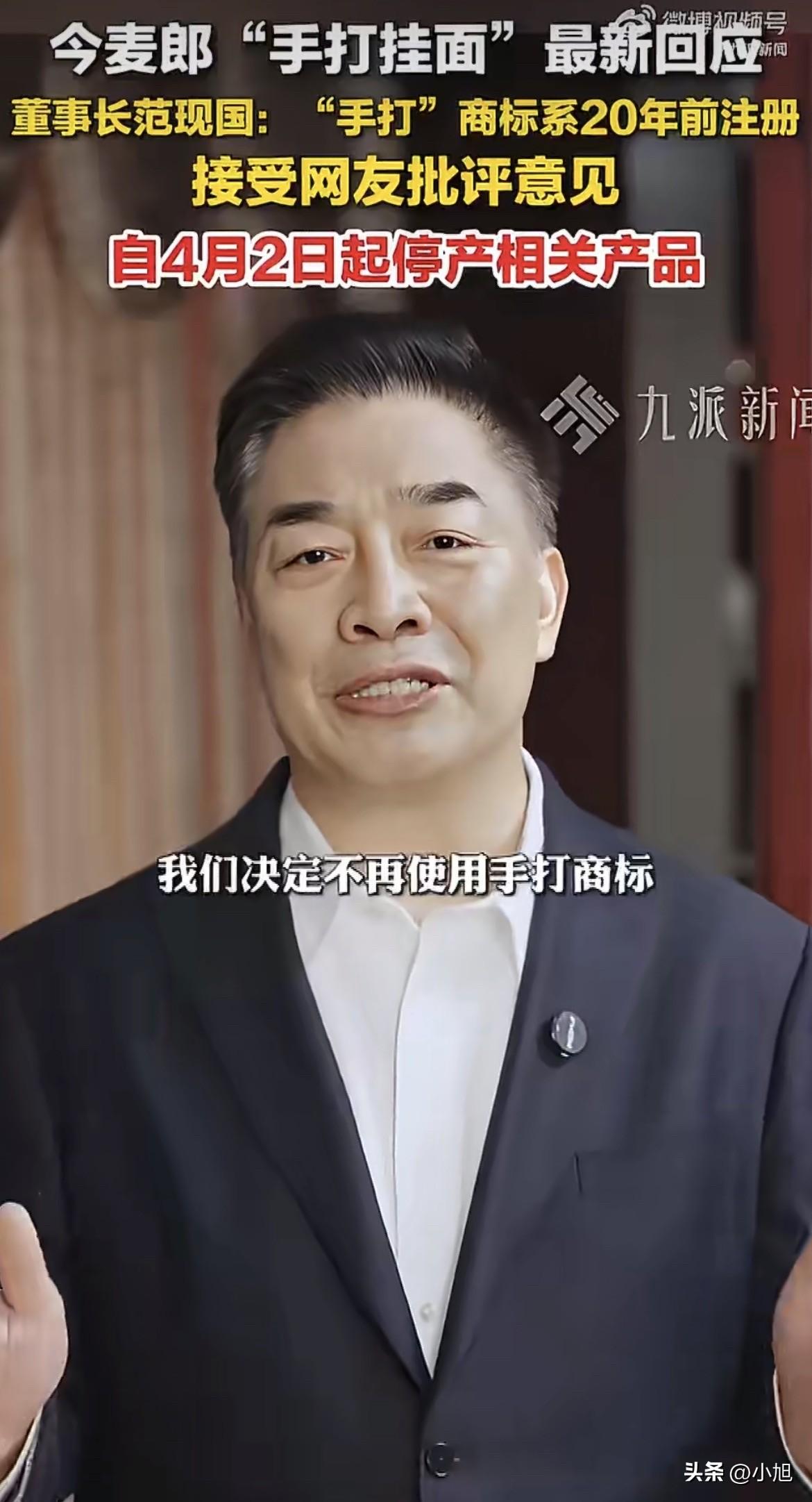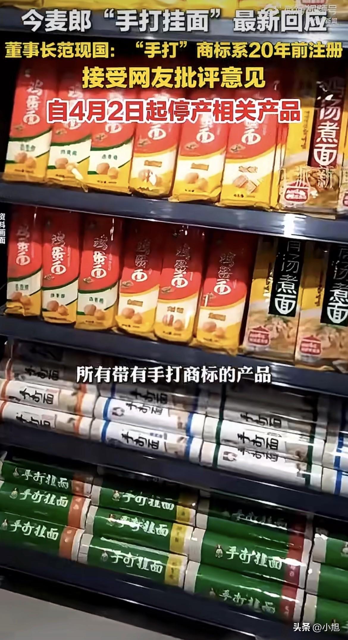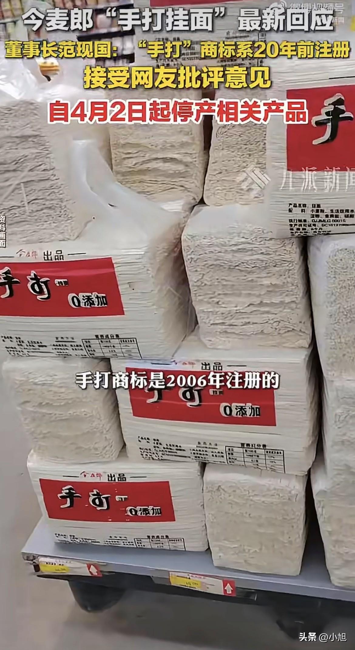 4月1日下午,今麦郎董事长范现国在社交平台发了一段视频,说“手打”商标他们已经用了20年,随着时代进步和消费者认知提升,产品也得跟上步伐,为了避免给大家带来产品表述上的困扰,决定不再使用这个商标。从4月2日凌晨起,所有带“手打”商标的产品全部停产。