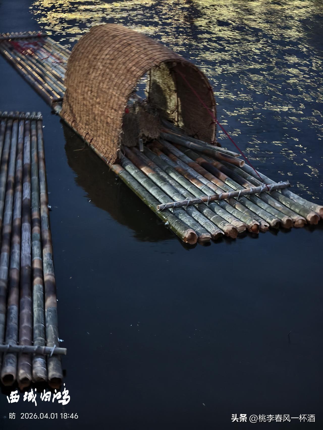 昨天晚上,到清风湖,没有游人,可能是太冷了,没有愿意容乱在风中。月亮已经升起,有两位匠人在做竹筏。不知道是用在清风湖旅游,还是用在别处。不过竹筏在哪儿一放还挺有意境。