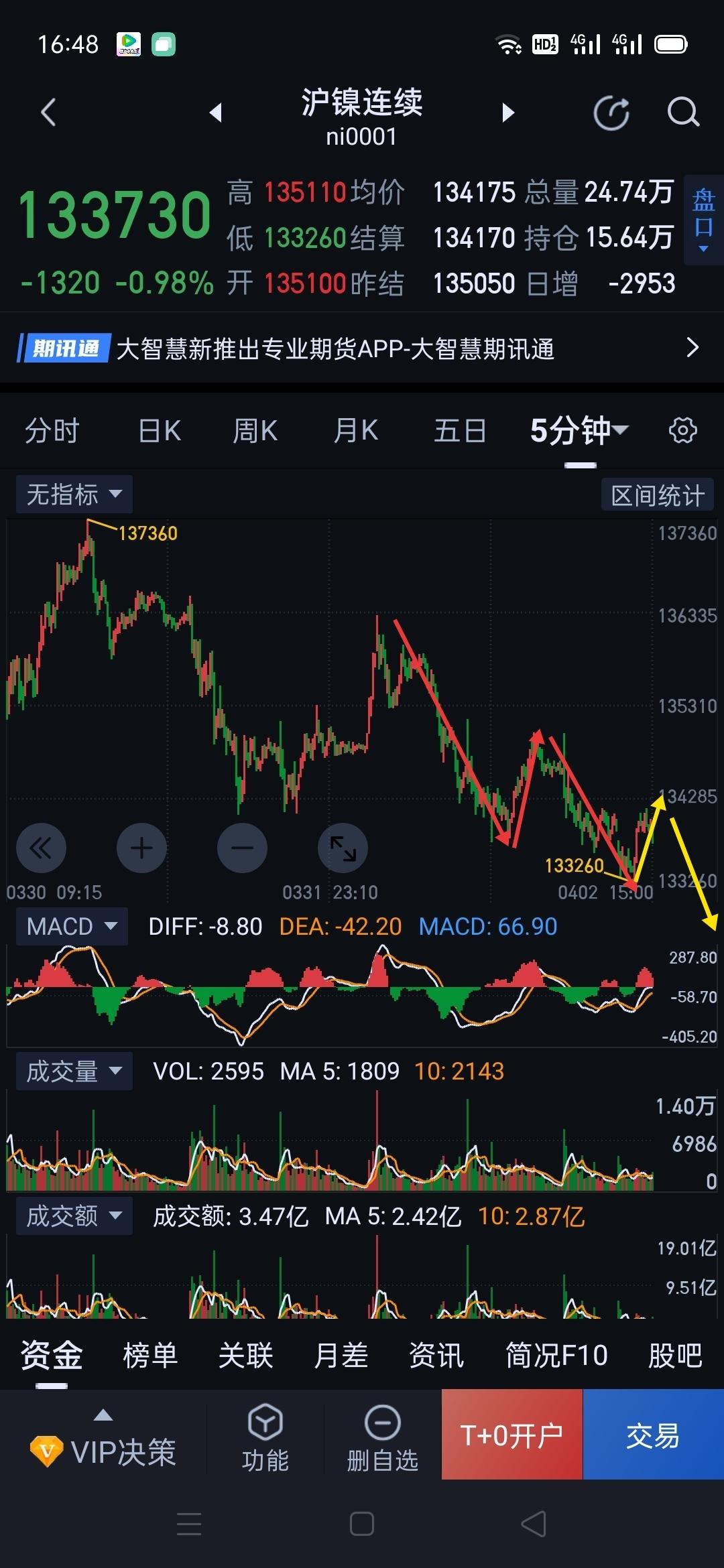 沪镍,多、空依然消极怠工,苟延残喘。 沪镍短期誓把震荡进行到底,走势依旧是围绕图(1)的震荡延伸。 如果近期能围绕图(2)形成一分钟级别背驰,多方可能借势上行。 本周沪镍,上行压力位137470,下行支撑位132160。