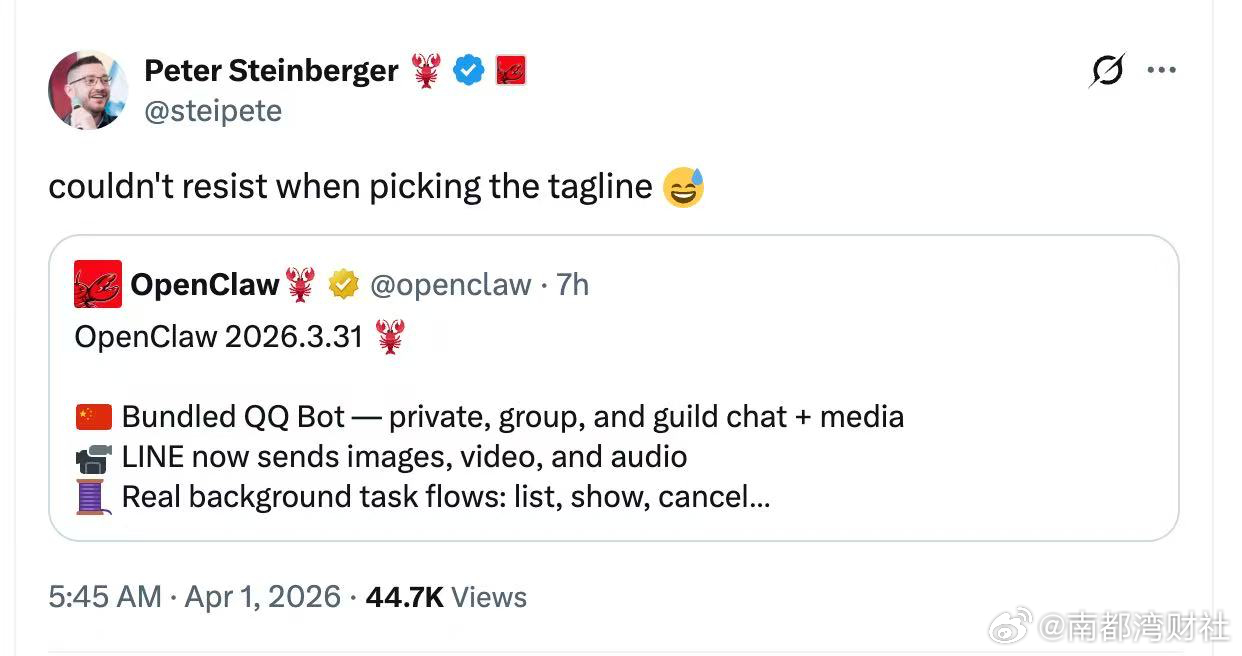 “龙虾”面世并引起广泛关注后,腾讯反应迅速,从云到应用全线接入“龙虾”。近期,腾讯也持续与OpenClaw展开相关合作。4月1日,OpenClaw发布v2026.3.31新版本,更新内置QQ Bot官方插件,QQ成为国内首个被OpenClaw官方原生接入的社交平台。腾讯轻量云协同QQ团队贡献的QQ Bot代码也已合入OpenClaw主仓库。随即,OpenClaw创始人Peter也对这一消息进行公开点赞。
