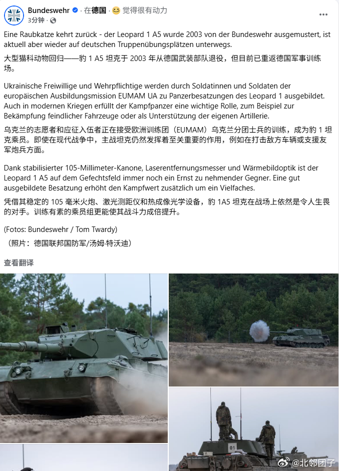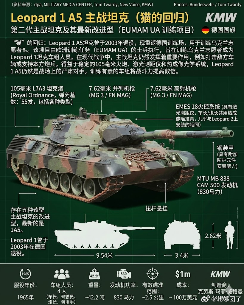 乌克兰武装在德国接受“豹1 A5“坦克训练,乌克兰获得的“豹1A5”并非现役装备,而是典型的“库存翻新型军援”。主要来源于欧洲军工企业长期封存的冷战遗产:德国莱茵金属和FFG仓库中保存的大量退役坦克,其中相当一部分原本来自丹麦、意大利等国早年退役装备。此外,莱茵金属还从比利时私营公司OIP手中回购约50辆库存坦克,计划翻修后向乌克兰交付约30辆 。