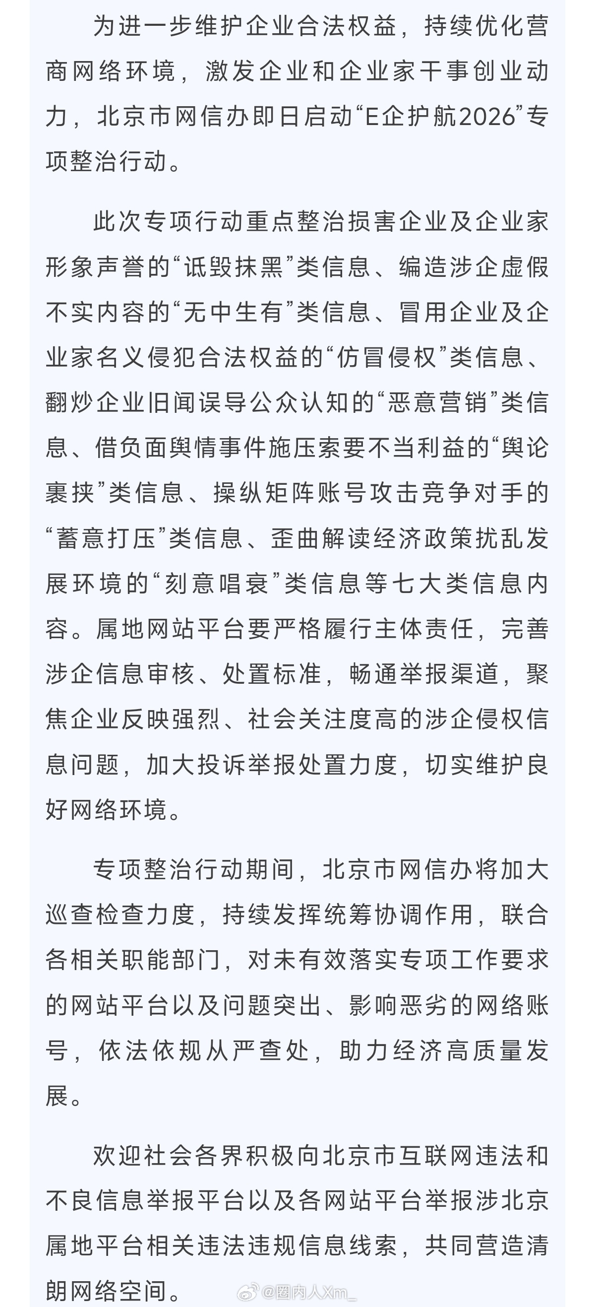 北京市网信办行重点整治损害企业及企业家形象声誉的“诋毁抹黑”类信息、编造涉企虚假不实内容的“无中生有”类信息、冒用企业及企业家名义侵犯合法权益的“仿冒侵权”类信息、翻炒企业旧闻误导公众认知的“恶意营销”类信息、借负面舆情事件施压索要不当利益的“舆论裹挟”类信息、操纵矩阵账号攻击竞争对手的“蓄意打压”类信息、歪曲解读经济政策扰乱发展环境的“刻意唱衰”类信息等七大类信息内容。