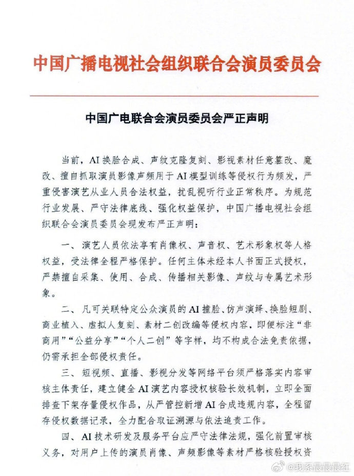 中国广电联合会演员委员会就当前AI换脸合成、声纹克隆复刻、影视素材任意纂改、魔改、擅自抓取演员影像声频用于AI模型训练等侵权行为发声明↓