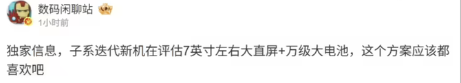 [IT168原创新闻]博主@数码闲聊站今日爆料,某厂子系迭代新机正在评估7英寸左右大直屏搭配万级(10000mAh以上)大电池的设计方案。结合该博主此前的爆料习惯以及网友分析,预计该机型为小米旗下红米(REDMI)新机。