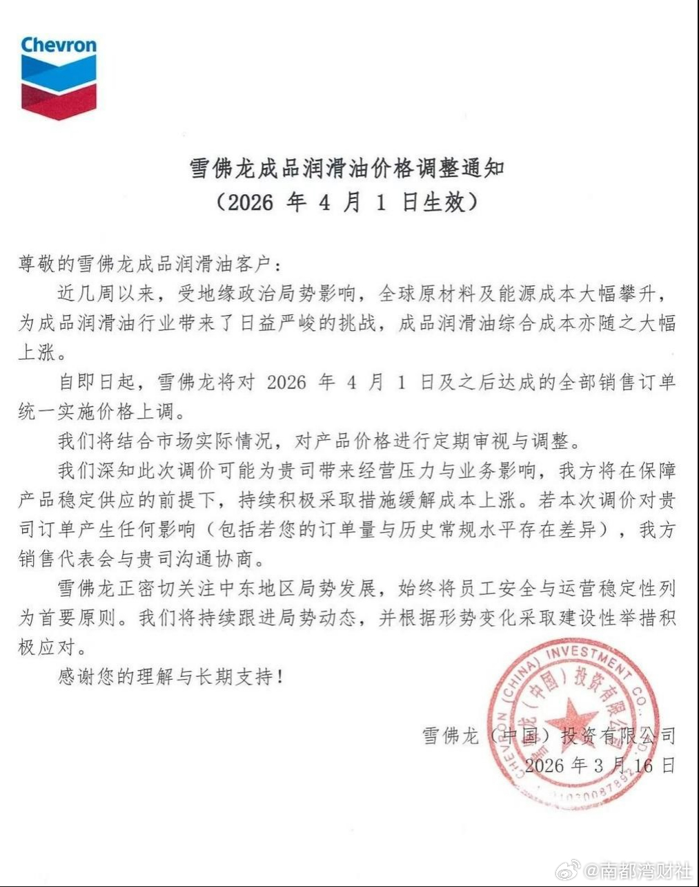 【#4月起养车成本要涨#,美孚、壳牌、嘉实多等机油品牌集体涨价】#美孚壳牌嘉实多等机油品牌集体涨价# 受国际原油及原材料成本大幅上涨影响,近期,多个成品油品牌先后迎来涨价。据统计,截至目前,已有美孚、壳牌、嘉实多、长城等十余个国内外品牌宣布上调价格,涨幅普遍在5%-10%之间。进入4月,车用机油、润滑油将迎来一轮涨价窗口期,也将导致养车成本的上涨。嘉实多Castrol于3月中旬发布公告称,近期,受国际原油价格持续大幅上涨影响,上游各类原材料成本同步攀升,给企业生产经营带来了前所未有的压力。为保障产品品质稳定、确保供货与服务可持续,决定对车用润滑油和工业油产品进行价格调整,新的价格于2026年4月1日起执行。壳牌中国公告称,受国际原油价格持续快速攀升并高位震荡的影响,基础油、添加剂及包装材料等原材料价格出现显著波动,对公司生产运营成本带来了持续上升的压力。鉴于原材料成本涨幅已远超预期,仅靠内部挖潜已难以完全消化成本压力。公司在承担部分成本上涨的同时,对全线润滑油产品进行价格调整。据介绍,新价格方案将于2026年4月6日起执行,同时不排除后续进一步价格调整的可能性。雪佛龙中国表示,受地缘政治局势影响,全球原材料及能源成本大幅攀升,为成品润滑油行业带来了日益严峻的挑战,成品润滑油综合成本亦随之大幅上涨。雪佛龙将对2026年4月1日及之后达成的全部销售订单统一实施价格上调。此外,昆仑润滑油、中国石化润滑油、东风嘉实多、统一石油化工等品牌已于3月进行了一轮润滑油产品销售价格上调。其中,昆仑润滑系列产品销售价自2026年3月25日起全面上调,调价幅度为5%~10%。 公开资料显示,机油的主要成分是基础油(占比约90%),它直接来源于石油炼化。近期中东局势升级,占全球约30%海运石油贸易必经的霍尔木兹海峡通行受阻,导致国际油价剧烈波动,布伦特原油一度突破110美元/桶,直接推高了机油的生产成本。除了基础油,机油中的添加剂(占比约10%),特别是氢氧化锂等核心原料,成本也在上涨,进一步加剧了机油厂商的成本压力。多家品牌在公告中提到,公司密切关注地区局势发展,在采取措施优化成本结构的基础上,尽力保证产品稳定供应,后续价格还将根据市场形势动态调整。 南都N视频APP · 政商数据