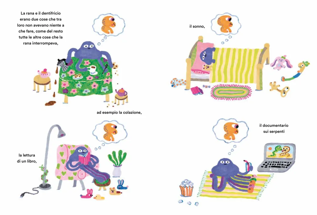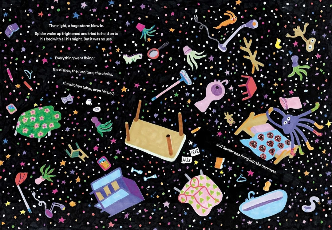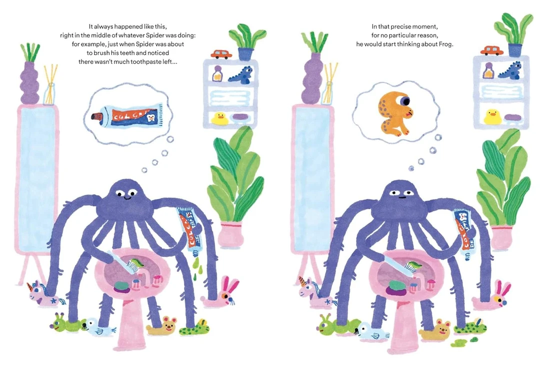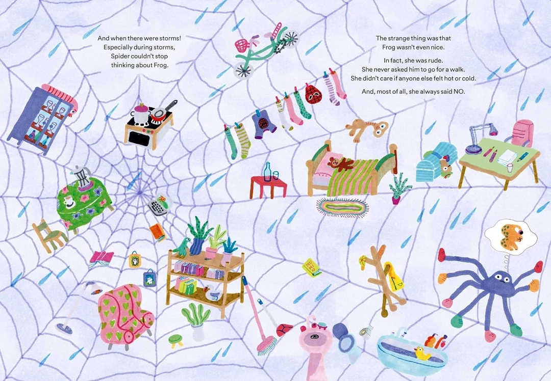 一只善良和充满爱心的蜘蛛,无时无刻都在关注和关心青蛙。无论它在做什么——刷牙、看书,或是看暴风雨来临,总会想起青蛙。