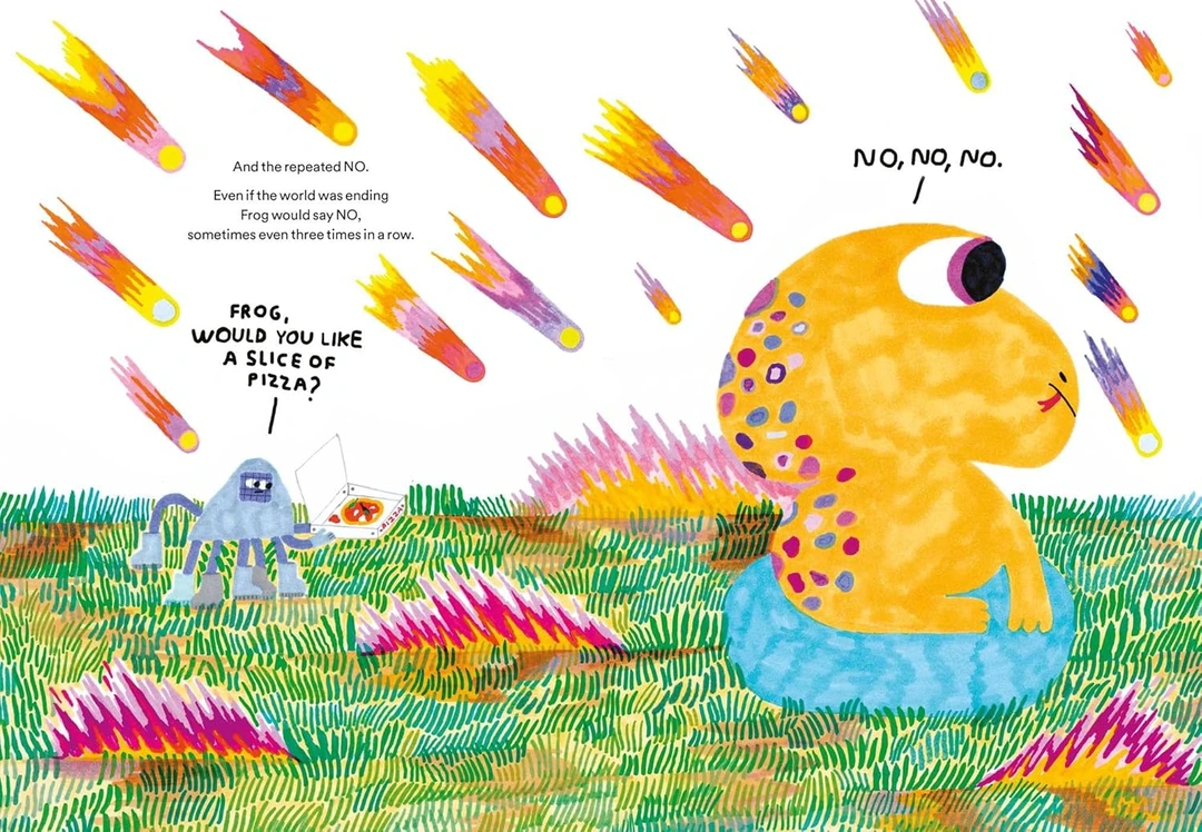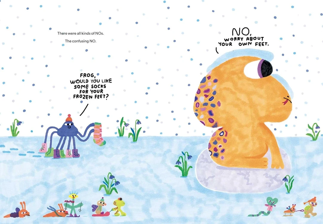 但让蜘蛛费解的是,青蛙从不会接受蜘蛛的建议——在下雪时,蜘蛛问:你要不要穿袜子,会冻坏的;在打雷时,蜘蛛问:你要不要避雷针?在发洪水时,蜘蛛问:你要不要救生圈?果不其然,青蛙总是在说“NO”,而且是各种各样的“NO”——神秘的“NO”、难以捉摸的“NO”、重复的“NO”——无论蜘蛛提出什么建议,青蛙的回答永远是“NO”。