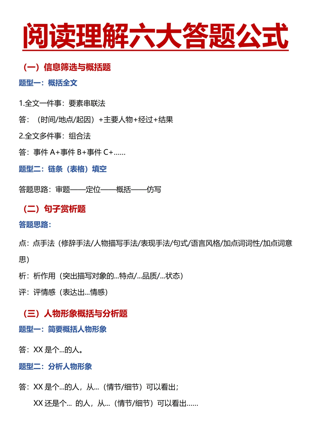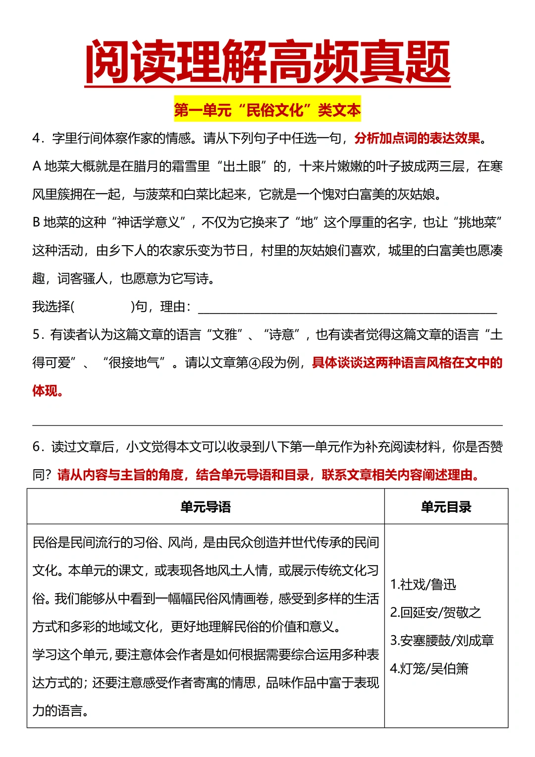 背诵文学性文本阅读理解六大答题公式,限时做 2 篇“民俗文化”单元类文阅读、2 篇 “ 自然的奥秘” 类文阅读训练,对照答案整理思路方法;学习非连续性文本阅读技法,完成 2 篇此类阅读,总结错题原因和技巧。