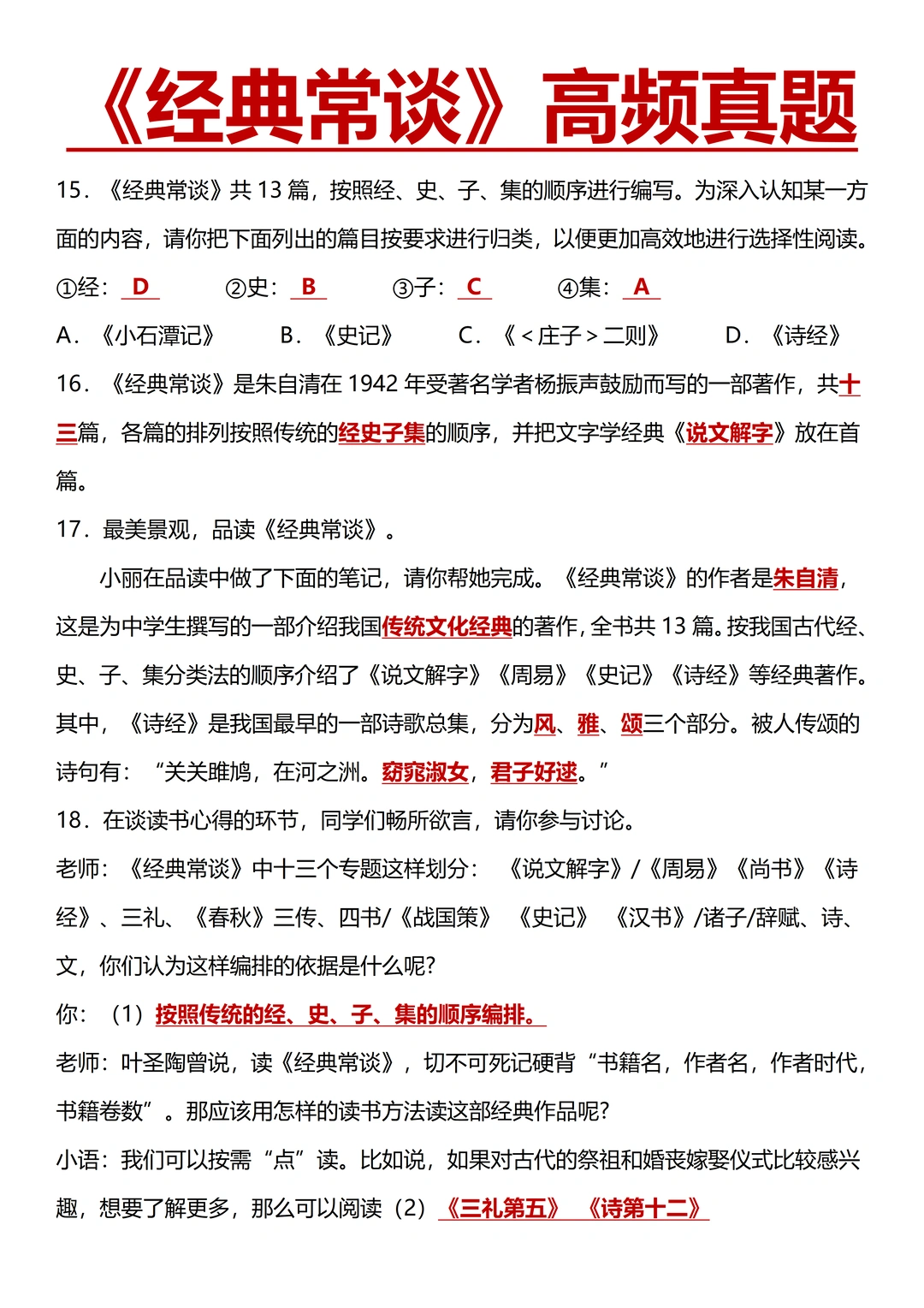 《经典常谈》要牢记章节内容、典籍构成与分类、造字法举例、经典思想的提炼概括,这些都是高频考点;过完知识点再完成名著高频真题,不清晰的部分要回看知识点和原著,查漏补缺。