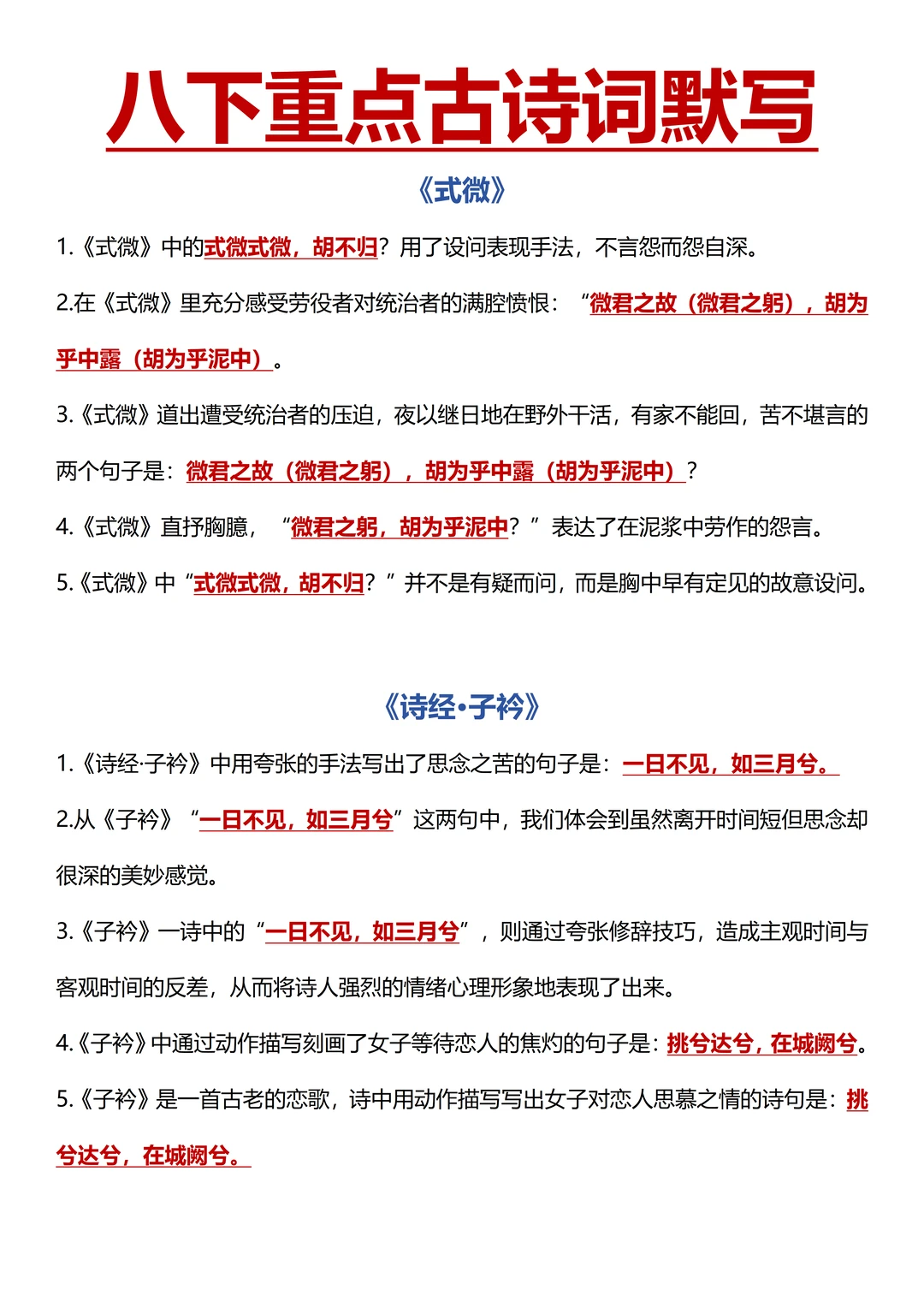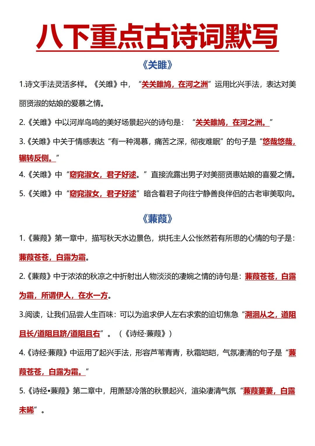 把《关雎》、《蒹葭》、《式微》、《子衿》《送杜少府之任蜀州》《望洞庭湖上张丞相》的原文、翻译、主旨情感背熟,完成专题资料里的直接性和理解性默写;背熟古诗鉴赏答题公式,然后去做课内、课外古诗鉴赏,锻炼实战能力。