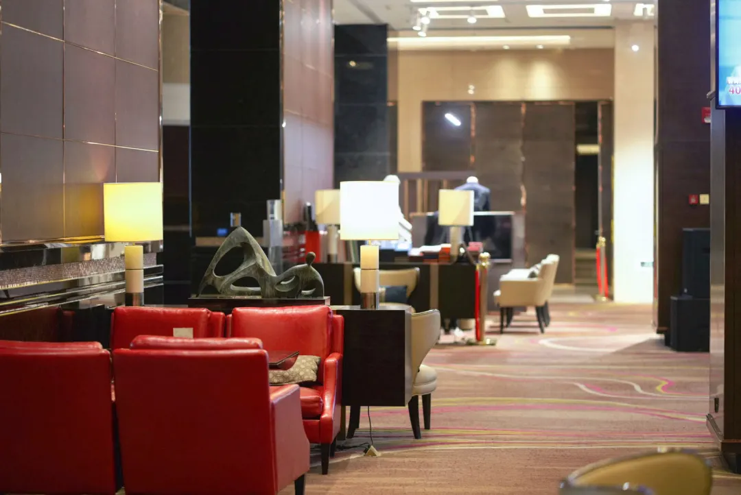 2. 机位推荐:大堂吧水景步道、旋转楼梯、发光立柱旁、前台背景墙