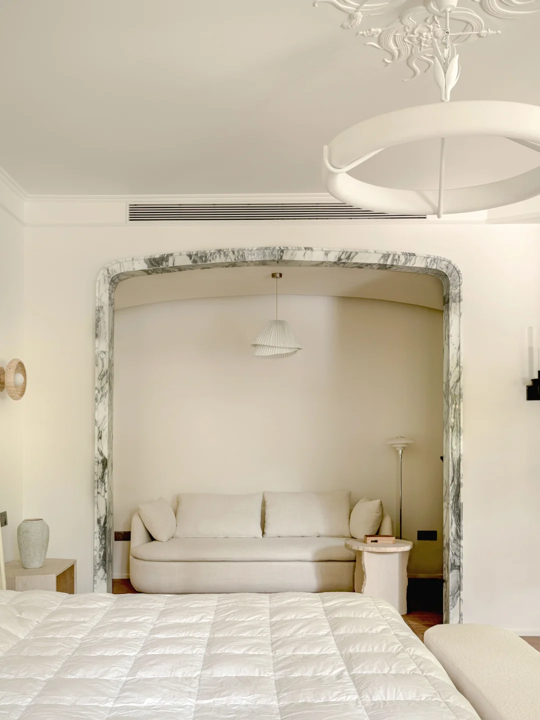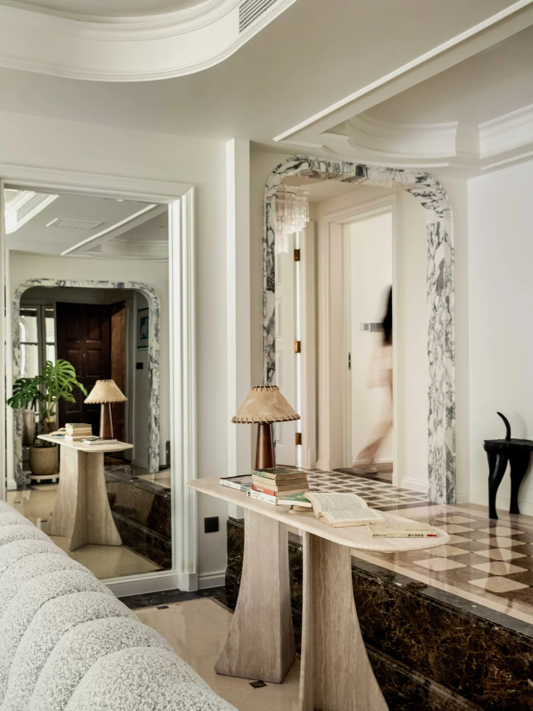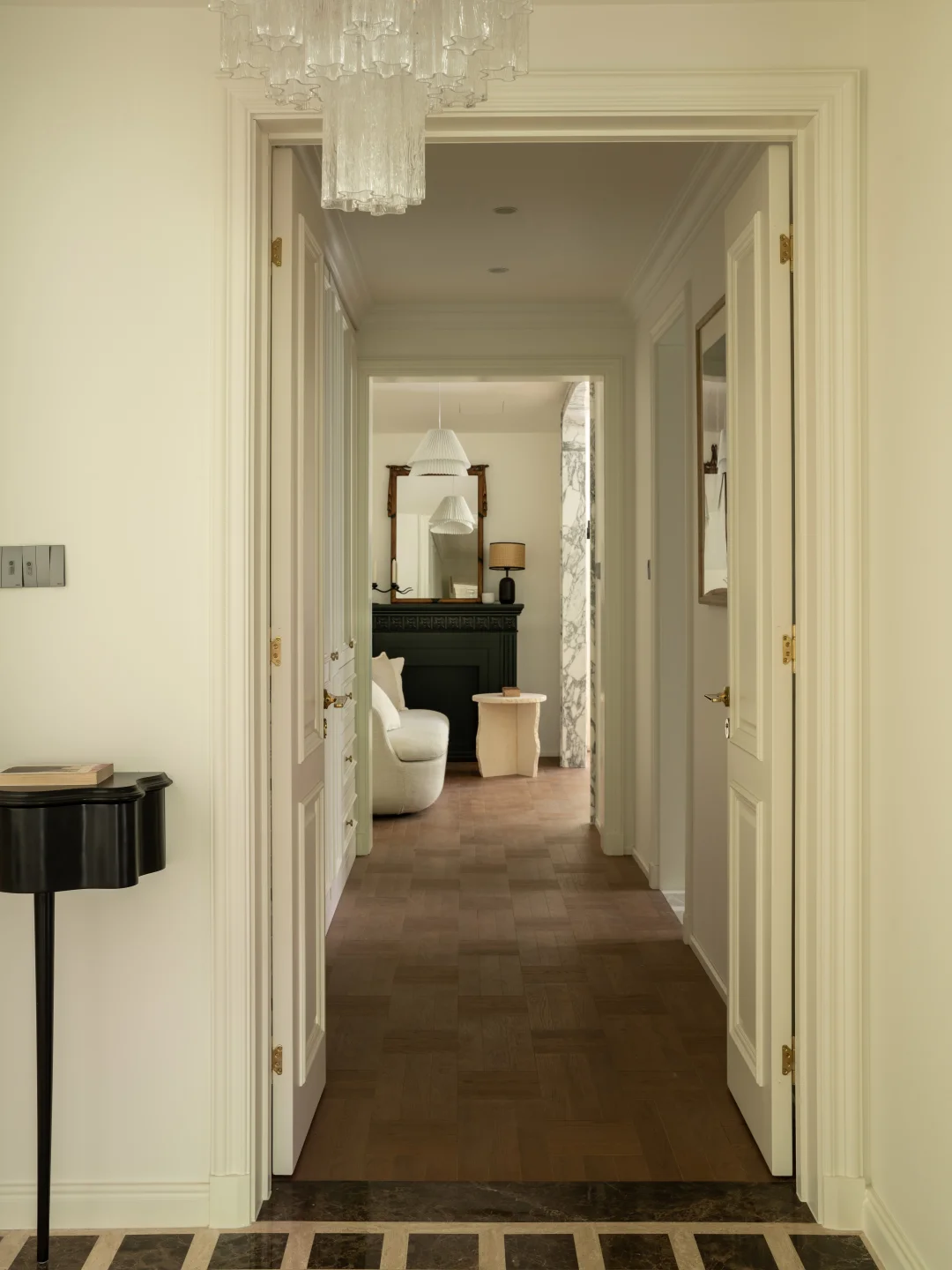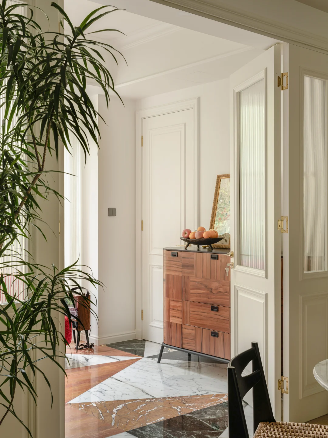 屋主的房子在一层,外面有个大花园, 于是我们就把视线打开,拆掉了原本碍眼的栏杆, 女主人还在花园里种了欧洲绣树、枫树、玫瑰... 现在一进门就能直接看到户外,满眼的绿色🌳真的太舒适了~ 原本的房屋墙面、地面都很“豪”,看多了就有点“油腻”了, 于是我们就保留了原本的地面, 在墙面上刷了一层米白色水性漆, 减弱了石材带来的冰冷感和压迫感 当然也少不了仪式感超强的双开门, 颜值高,又有气场~