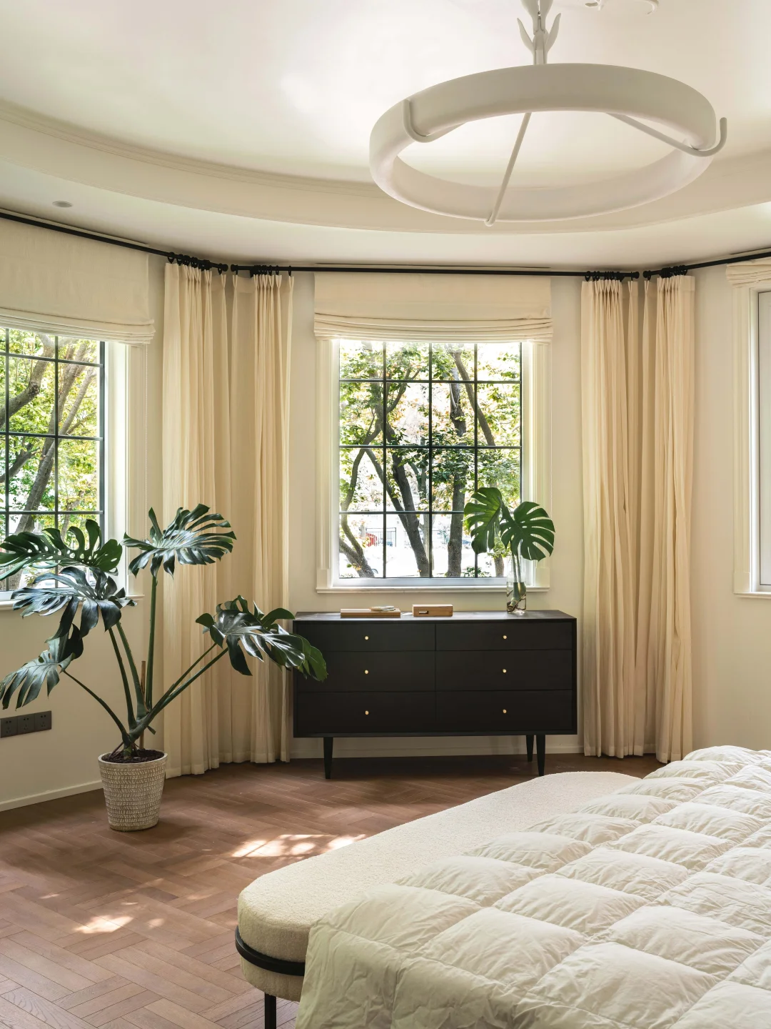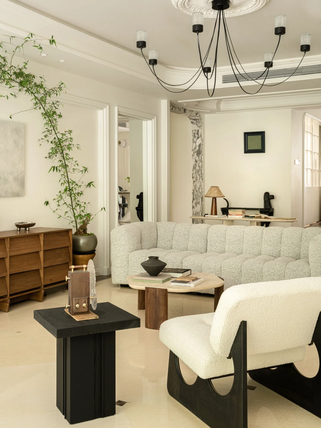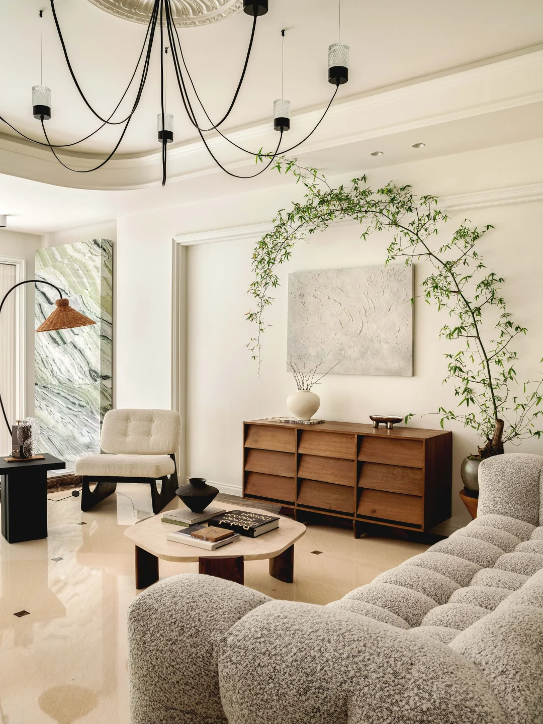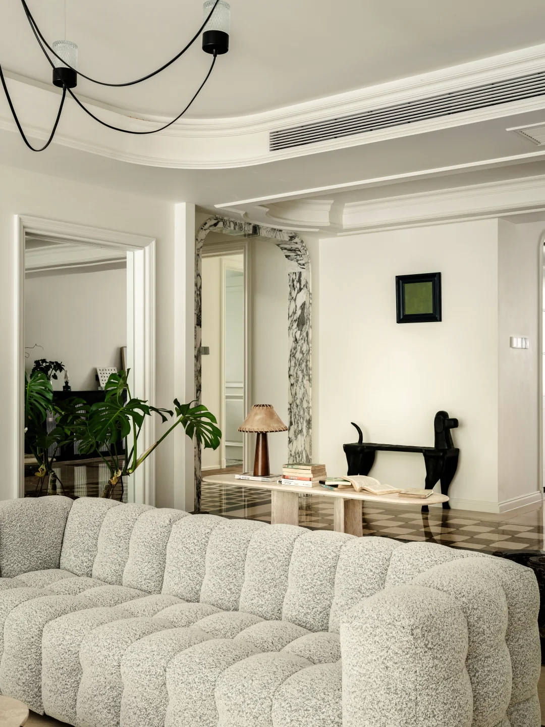 屋主的房子在一层,外面有个大花园, 于是我们就把视线打开,拆掉了原本碍眼的栏杆, 女主人还在花园里种了欧洲绣树、枫树、玫瑰... 现在一进门就能直接看到户外,满眼的绿色🌳真的太舒适了~ 原本的房屋墙面、地面都很“豪”,看多了就有点“油腻”了, 于是我们就保留了原本的地面, 在墙面上刷了一层米白色水性漆, 减弱了石材带来的冰冷感和压迫感 当然也少不了仪式感超强的双开门, 颜值高,又有气场~