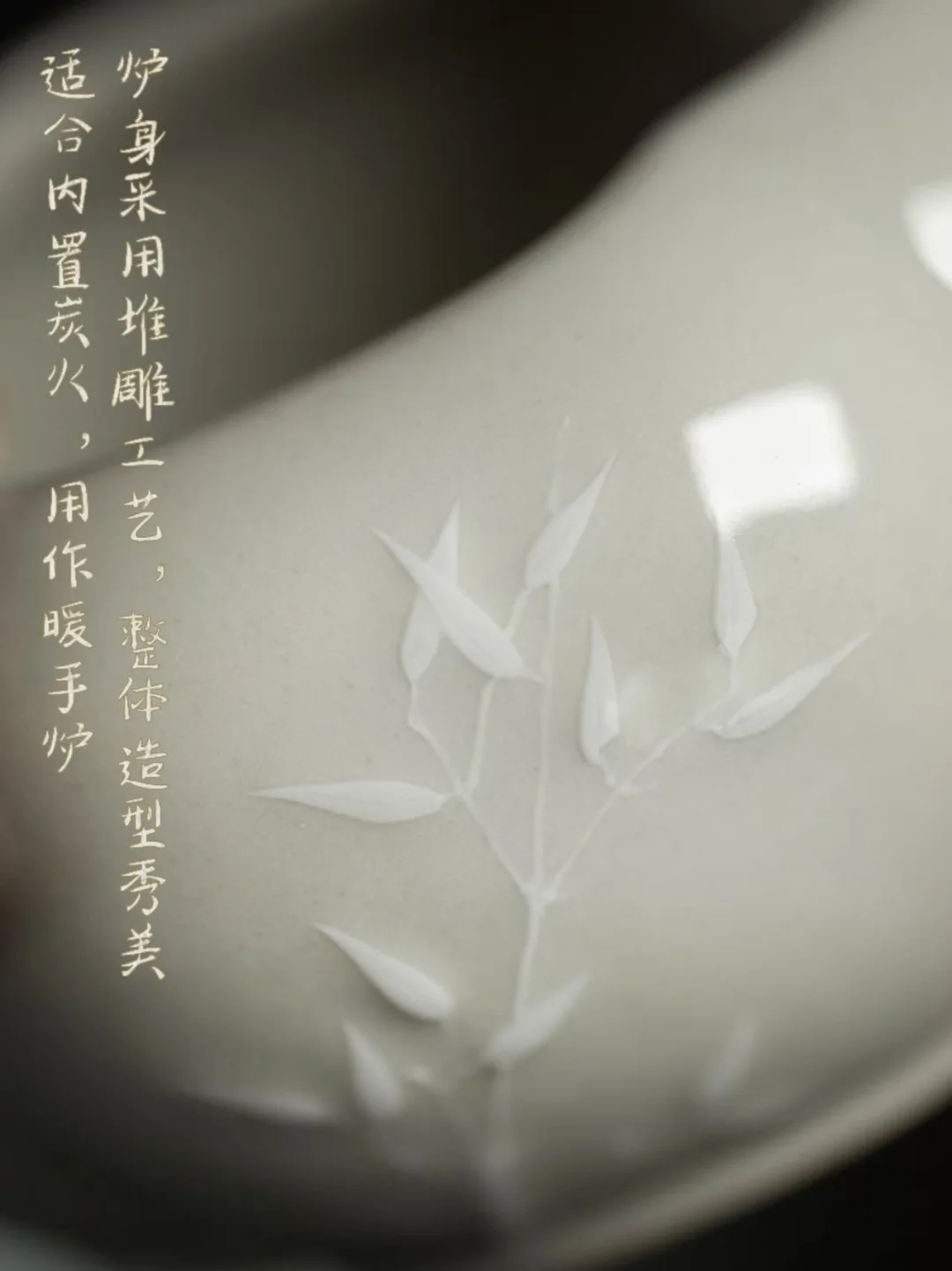 竹梅堆雕清雅,草木灰釉温润。它比寻常手炉大一些,可以双手捧着,让暖意传得更透。不暖手的时候,点一盘香,它又是一件雅致的案头清供。