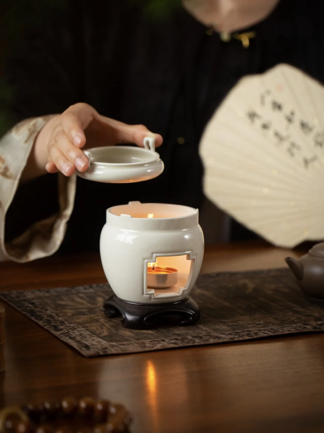 点燃一枚小蜡烛,看火苗在素白炉身里轻轻摇曳。香丸被慢慢煨热,香气一丝一丝渗出来。那点微光,是视觉上的暖;那缕香,是心里的暖。