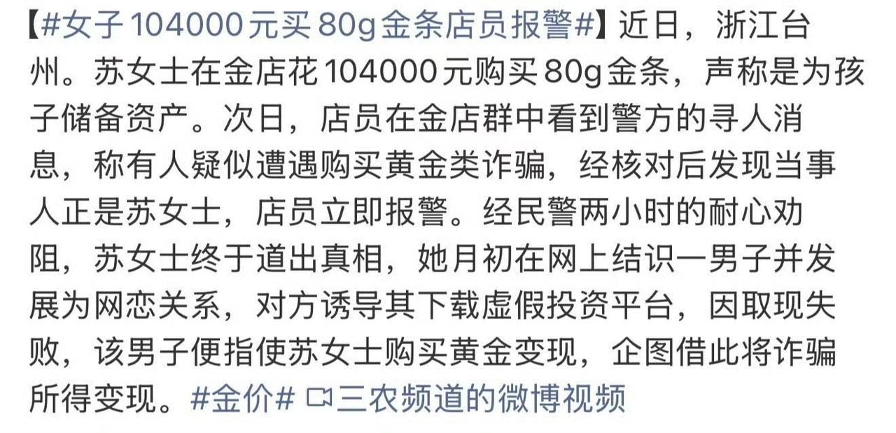 浙江台州,苏女士在金店花104000元购买80g金条,声称是为孩子储备资产。次日,店员在金店群中看到警方的寻人消息,称有人疑似遭遇购买黄金类诈骗,经核对后发现当事人正是苏女士,店员立即报警。经民警两小时的耐心劝阻,苏女士终于道出真相,她月初在网上结识一男子并发展为网恋关系,对方诱导其下载虚假投资平台,因取现失败,该男子便指使苏女士购买黄金变现,企图借此将诈骗所得变现。 目前,警方已对这起诈骗案件展开全面调查,努力追踪犯罪嫌疑人的踪迹。苏女士在经历这场骗局后,懊悔不已,她没想到自己仅仅因为一场网恋,就让多年的积蓄付诸东流。 警方提醒广大市民,在网络交友过程中要保持警惕,切勿轻易相信陌生人的投资建议。特别是涉及到金钱交易时,一定要通过正规渠道核实信息,避免陷入类似的诈骗陷阱。金店店员的及时报警行为值得赞扬,他们的敏锐察觉为阻止诈骗资金外流起到了关键作用。希望大家都能从苏女士的经历中吸取教训,守护好自己的财产安全。 黄金一克小金条 普通人买金条 金条避坑 银行实物金条 珠宝金条 精制金条 假金条骗局 金条抢购潮 金条销量 杭州姑娘买黄金 金条拆解 新年金条 金条退货 黄金营养小金条 沈阳金条 招财纳福金条 来源:微博智搜