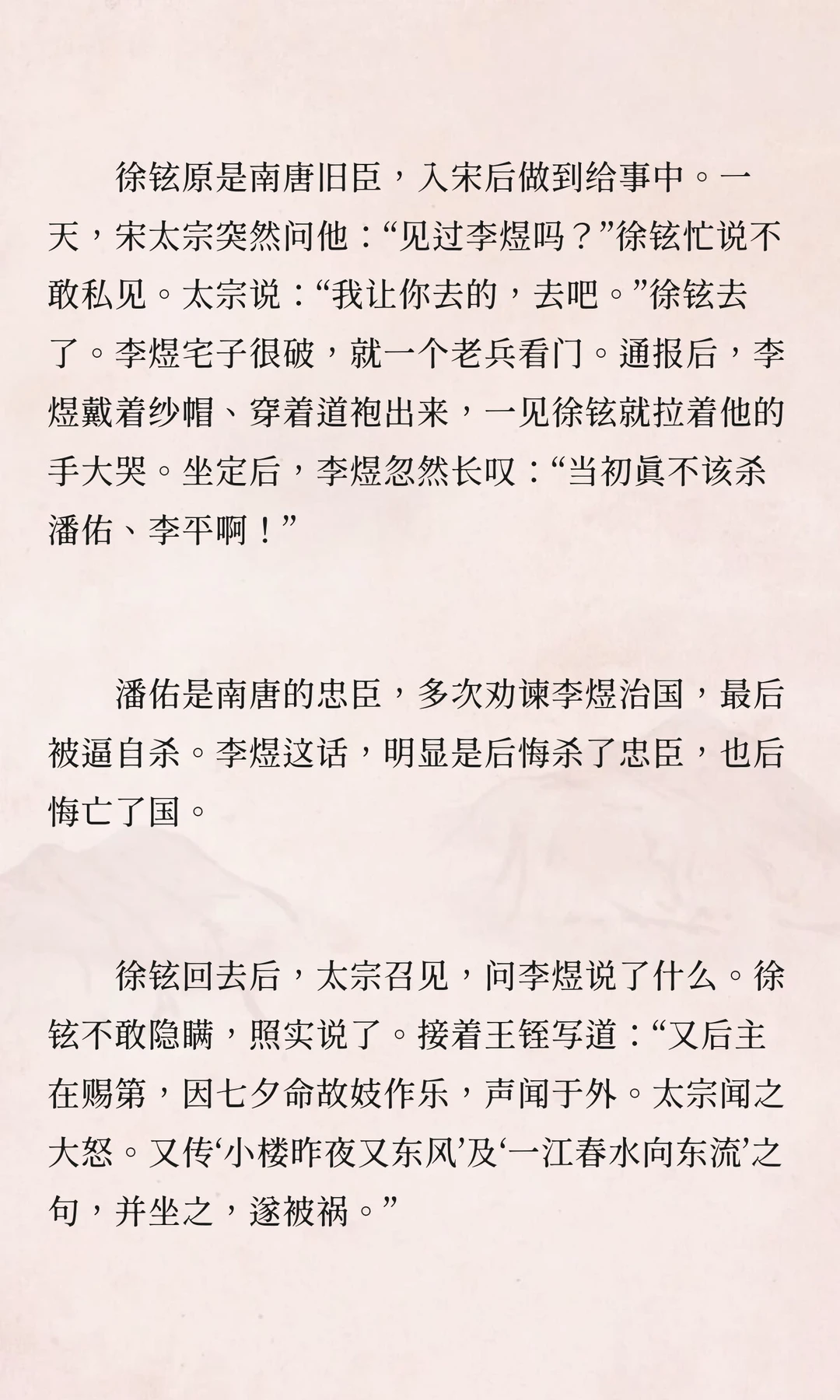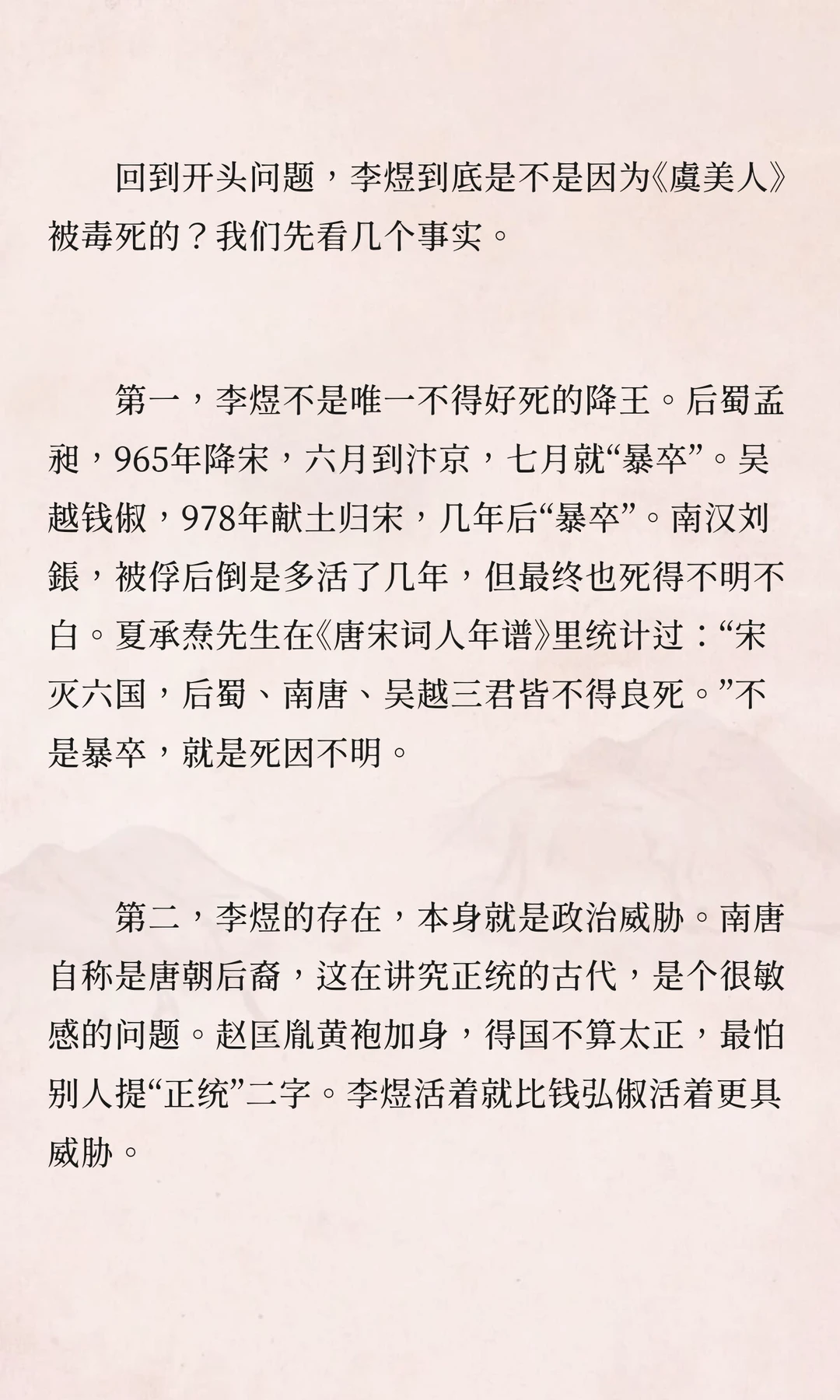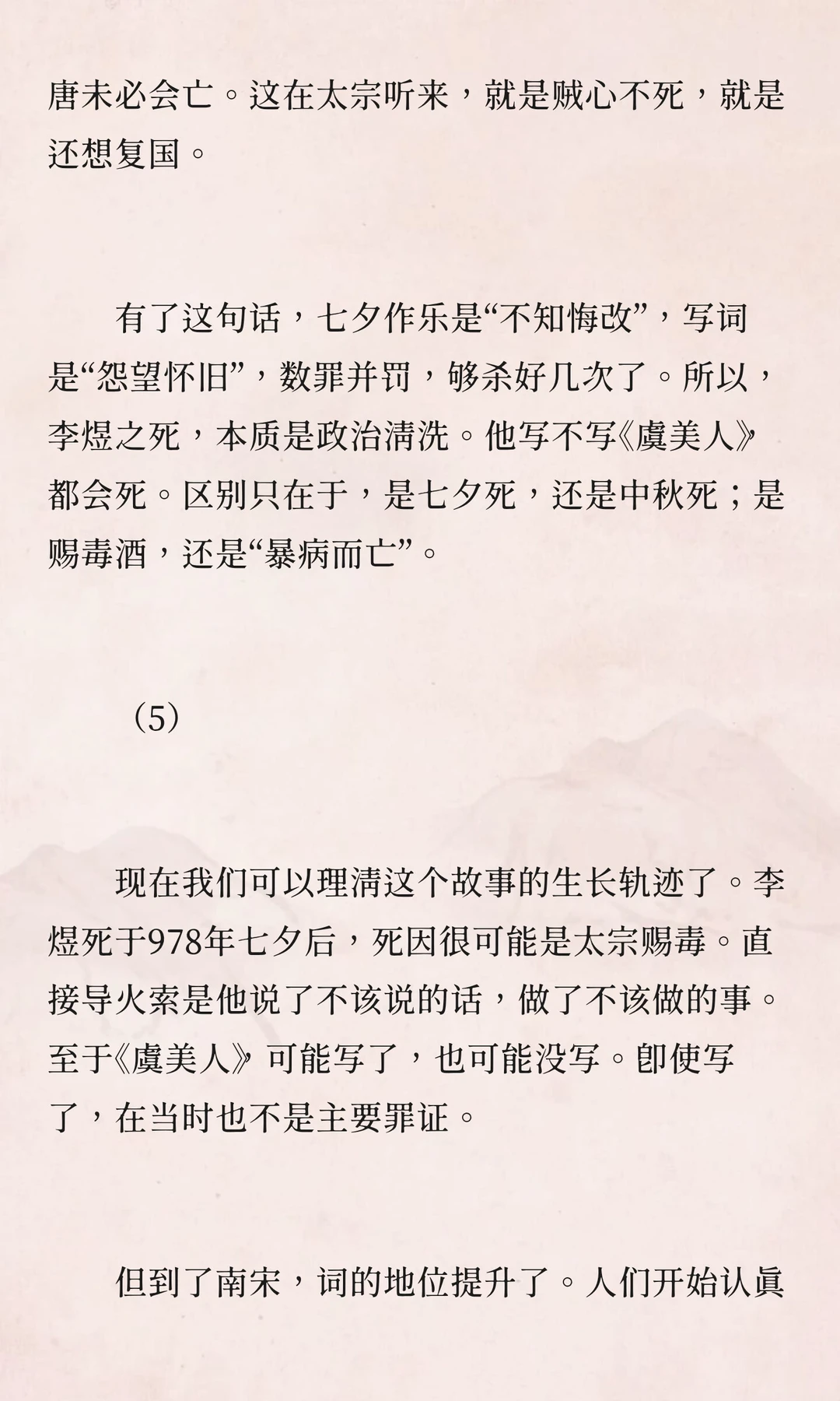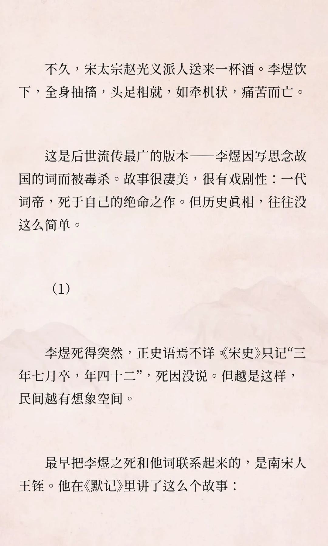 李煜因亡国之痛和怀念故国的词被宋太宗赐毒身亡,七夕作乐和“小楼昨夜又东风”等诗句成为其死因的象征。后世对他的死因有不同的解读,从清洗到艺术殉道,反映了历史书写中的“以今律古”。