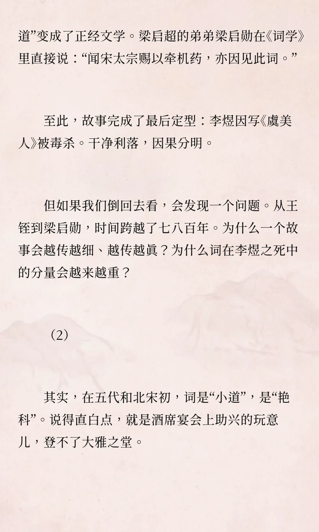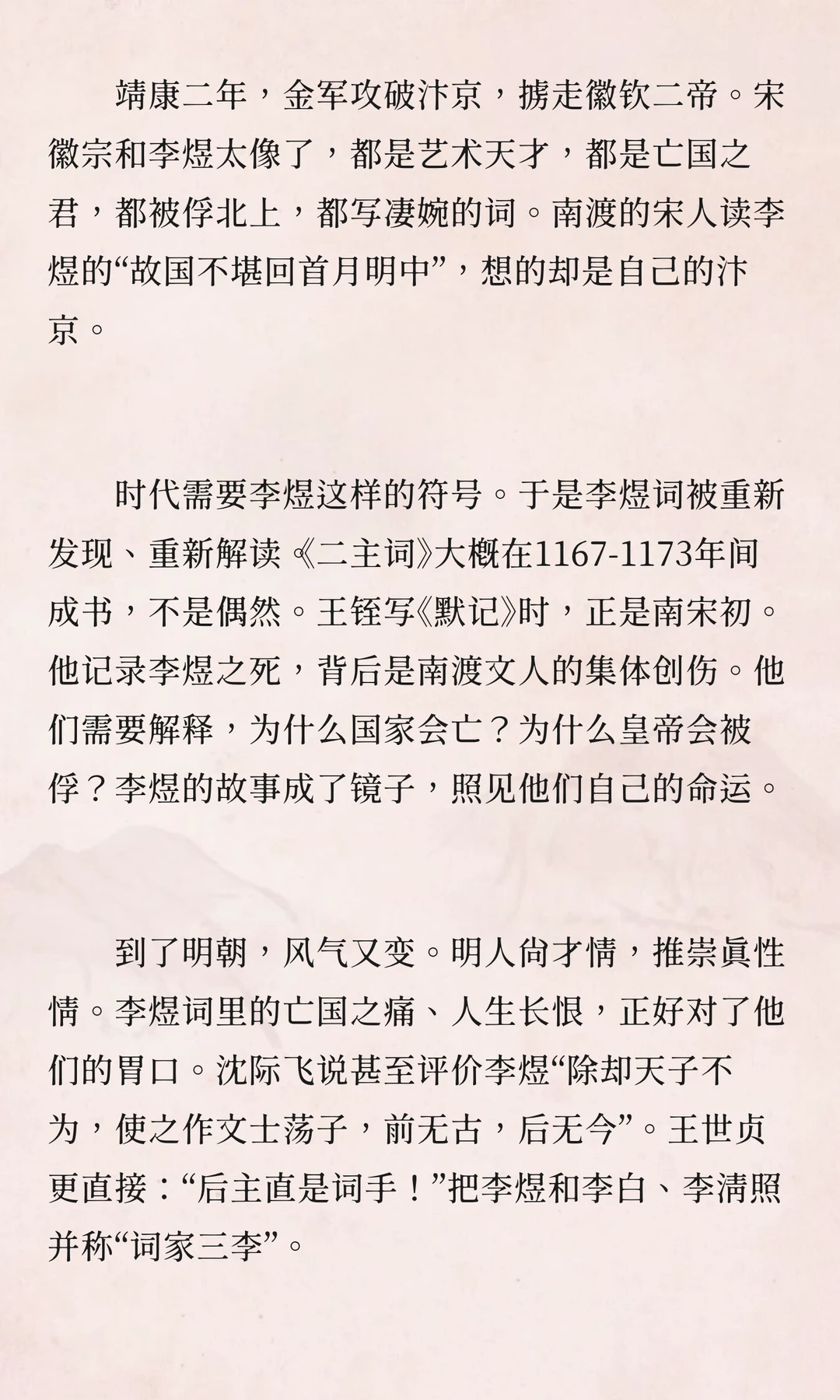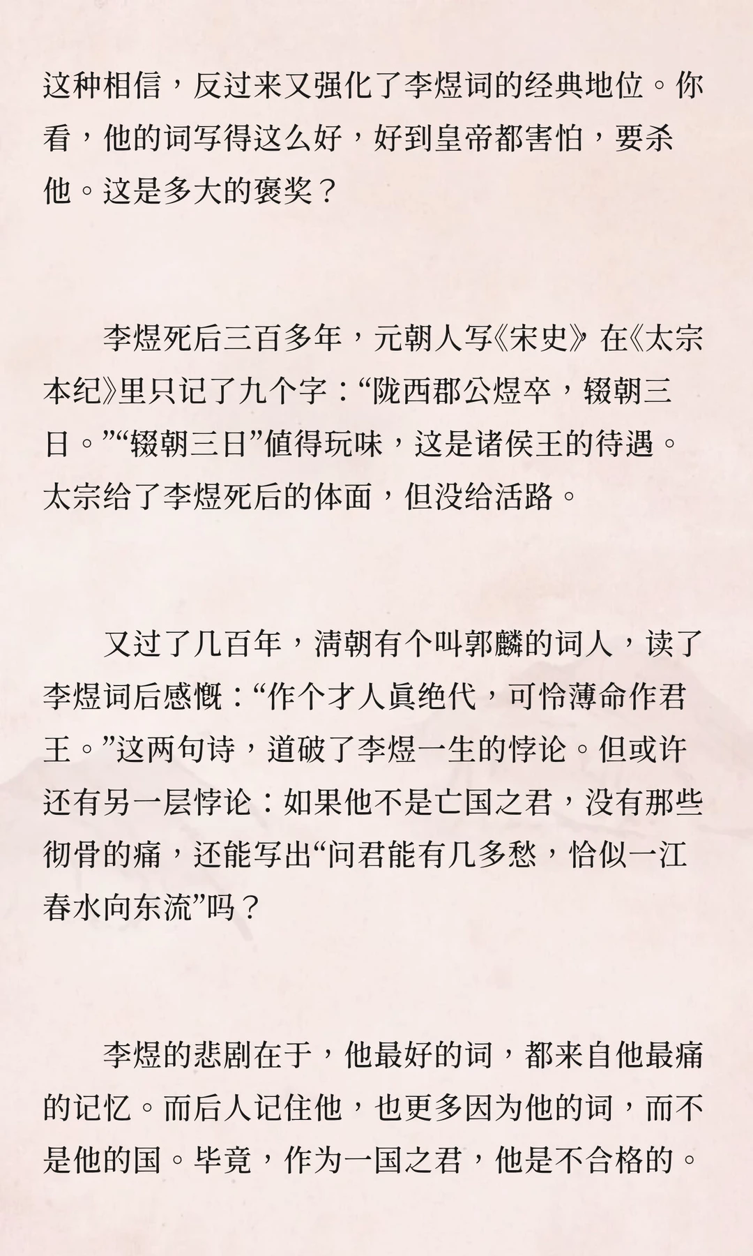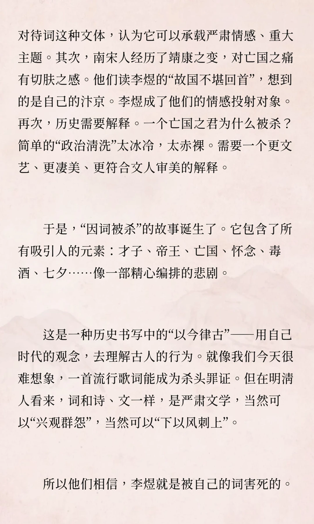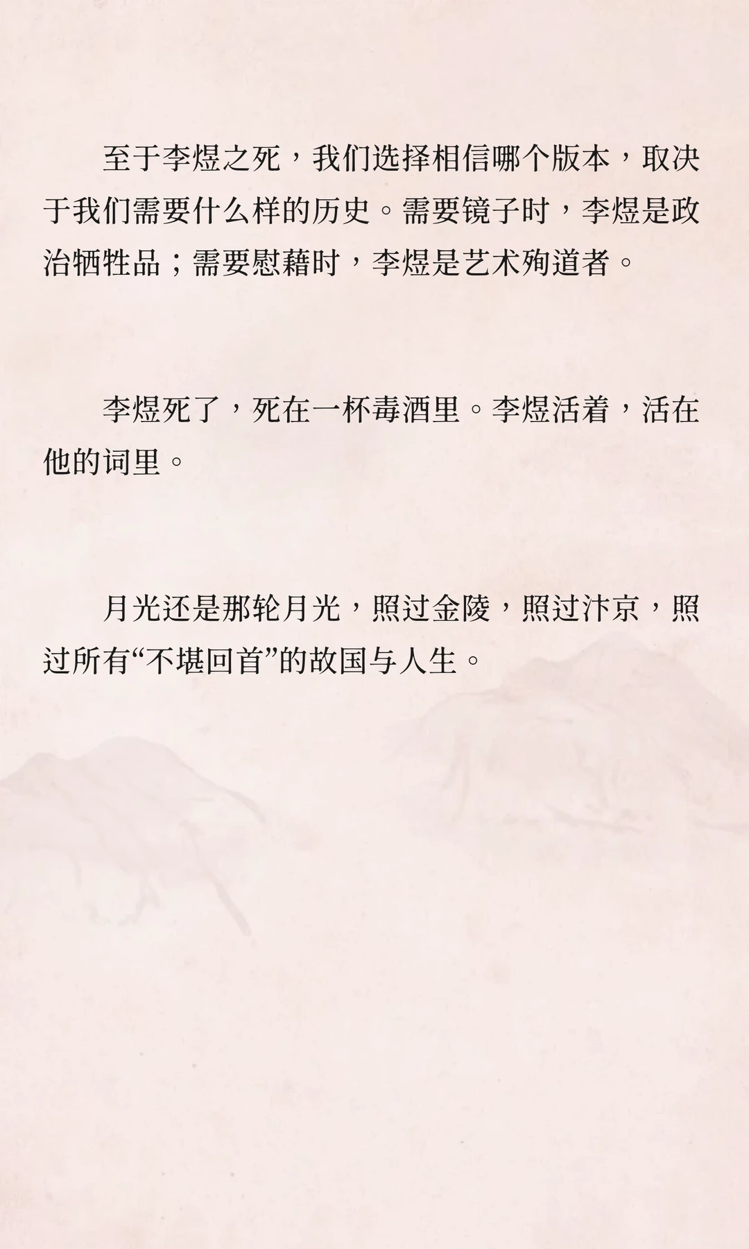 李煜因亡国之痛和怀念故国的词被宋太宗赐毒身亡,七夕作乐和“小楼昨夜又东风”等诗句成为其死因的象征。后世对他的死因有不同的解读,从清洗到艺术殉道,反映了历史书写中的“以今律古”。