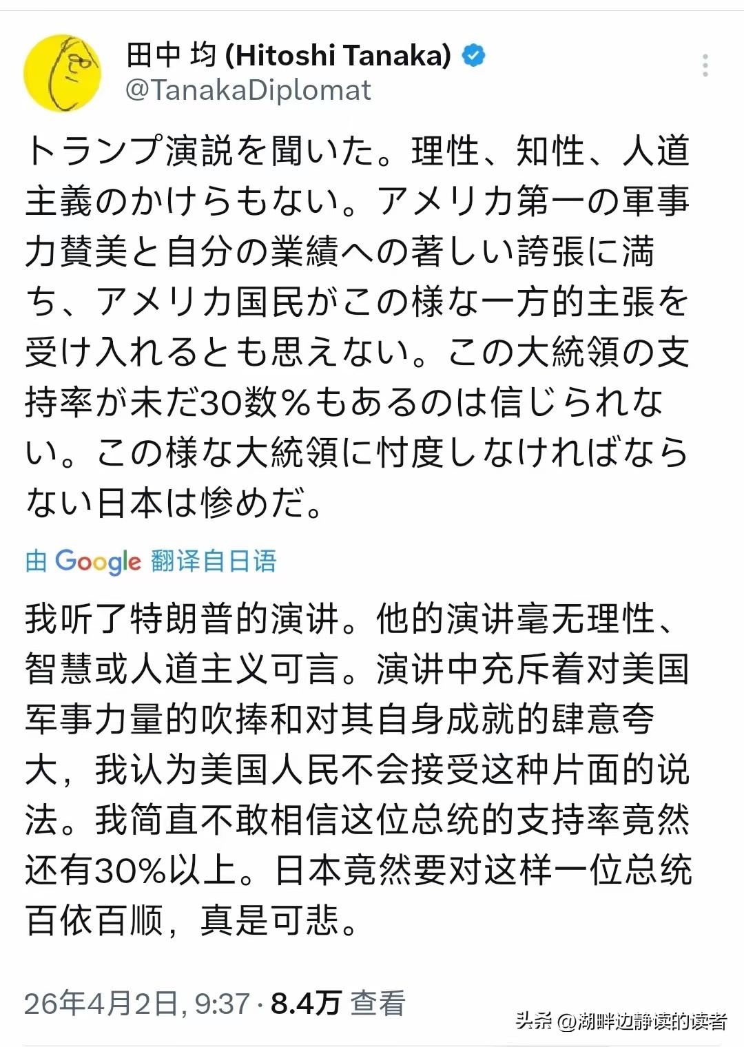 日本著名外交官、前外务副大臣田中均今天(4月2日)发文写道:“我听了特朗普的演讲。他的演讲毫无理性,智慧或人道主义可言。演讲中充斥着对美国军事力量的吹捧和对其自身成就的肆意夸大,我认为美国人民不会接受这种片面的说法。我简直不敢相信这位总统的支持率竟然还有30%以上。日本竟然要对这样一位总统百依百顺,真是可悲。” 田中均拥有近四十年外交履历,长期执掌日本亚洲与北美外交事务,是日本政坛公认的务实派战略家,此番发声绝非一时意气。 最新民调数据显示特朗普支持率仅为36%,创下重返白宫以来最低值,六成以上美国民众反对其激进外交与军事冒险政策。 日本政府为维系所谓日美同盟,在经贸、安保、外交议题上全面迎合美方要求,不断退让国家利益换取所谓安全承诺。 驻日美军规模维持在4.5万人左右,日本每年承担超8000亿日元驻留经费,沦为美国亚太战略的付费附庸。 日本政坛亲美势力刻意掩盖对美依附的现实,将无条件顺从包装为战略智慧,引发国内理性阶层强烈不满与反思。 特朗普执政风格反复无常,动辄以撤军、加征关税要挟盟友,日本在妥协中丧失外交主动权,安全保障愈发脆弱。 日本媒体与学界纷纷转发田中均言论,批评政府对美外交丧失底线,呼吁重拾战略自主,维护本国核心利益。 美国将日美同盟视为遏制地区大国的工具,从未将日本视作平等伙伴,关键时刻只会牺牲日本利益保全自身。 日本防卫预算连年攀升至GDP的2%,大量资金投入美国主导的武器采购,国内民生投入被持续挤压。 田中均直指日本外交可悲,戳破亲美路线的虚假繁荣,道出战后日本长期缺乏完整主权的真实困境。 欧洲多国已公开与美国保持距离,坚持战略自主,日本却仍深陷对美依附,在国际舞台愈发孤立被动。 特朗普鼓吹单边主义与霸权思维,破坏全球多边秩序,日本紧跟其后,损害自身国际形象与长远发展空间。 日本民众对无底线对美妥协的不满持续升温,街头抗议与舆论批评不断,要求政府调整外交路线的呼声高涨。 一国外交的核心是维护本国利益,盲目依附强权、放弃自主判断,最终只会沦为棋子,付出沉重代价。 日本特朗普 日本高官 特朗普怒怼日本 田中义久 田中良子 麻烦看官老爷们右上角点击一下“关注”,既方便您进行讨论和分享,又能给您带来不一样的参与感,感谢您的支持! 各位读者你们怎么看?欢迎在评论区讨论。