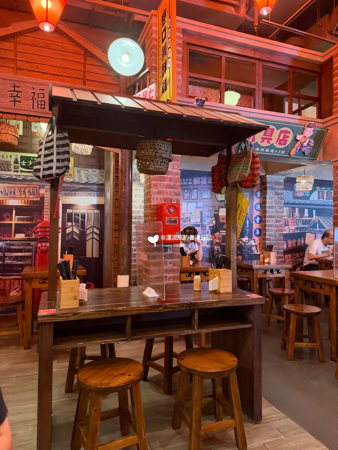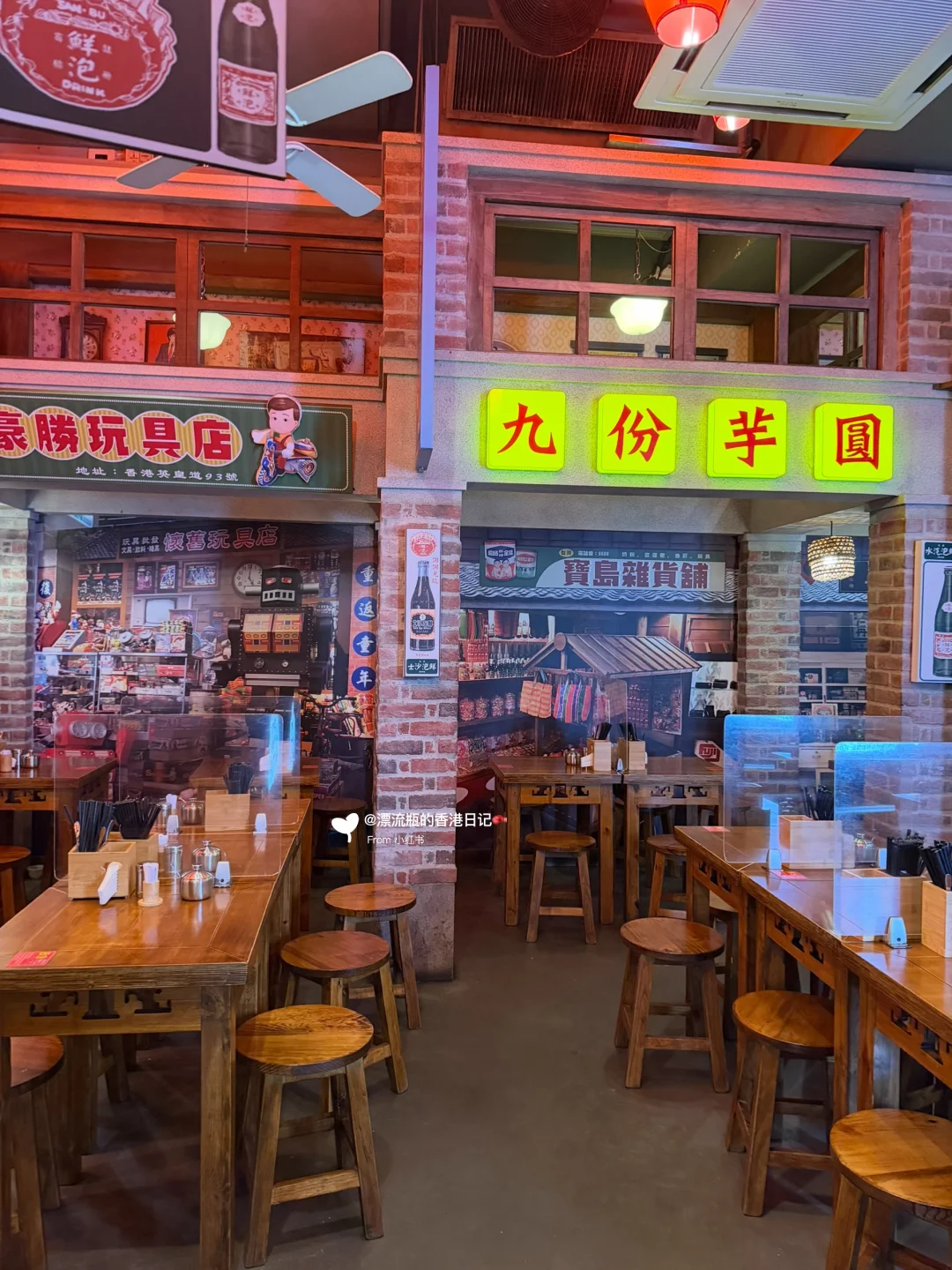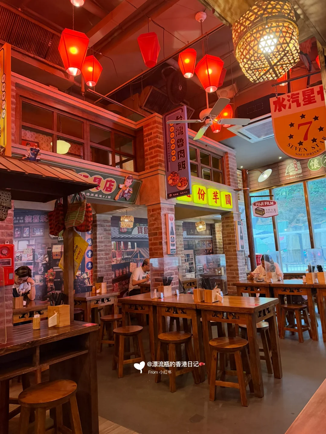 装修应店名,门口是车站🚉,开门进店后有穿越到台北九份的感觉,红色灯光💡主打怀旧氛围。每个座位顶上都是不同的小店招牌