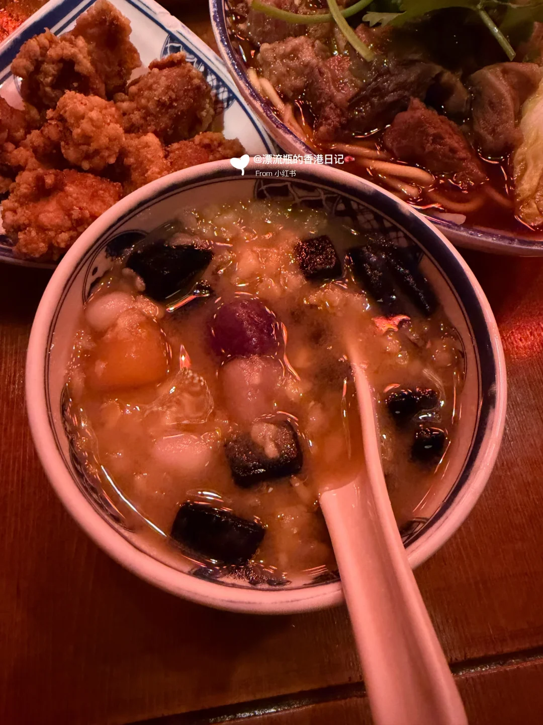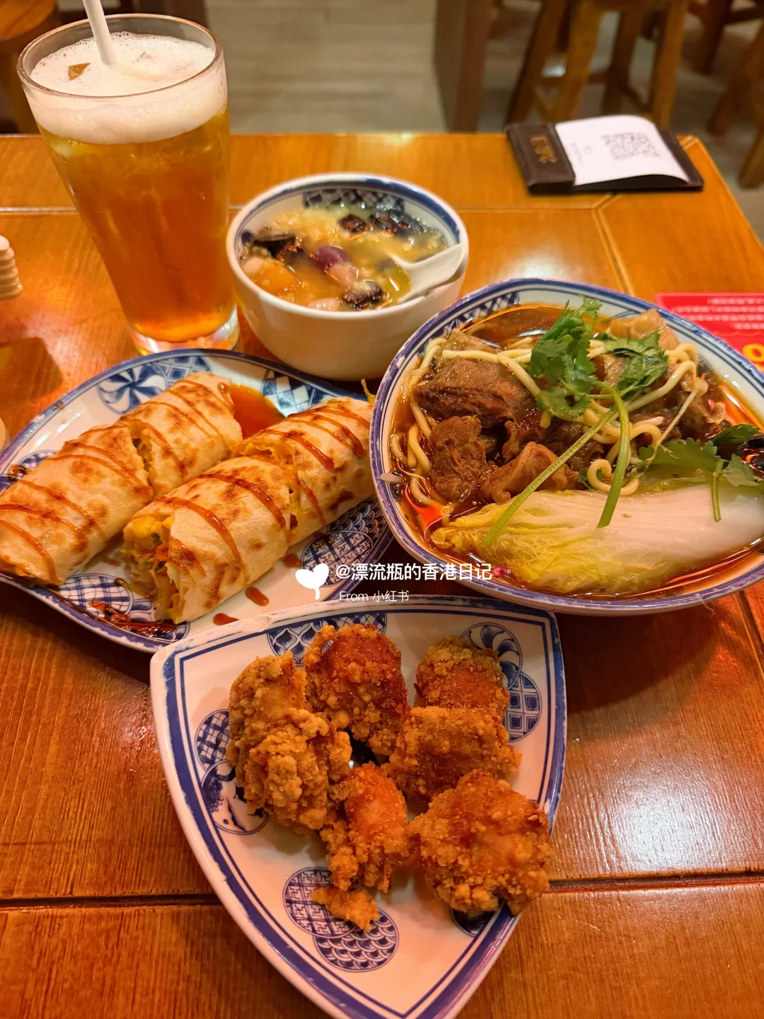 两个人点了三个下午茶套餐:蛋饼➕芋圆🥤、牛肉面➕奶茶🧋、盐酥鸡➕chua包,吃超饱,人均只要60港币