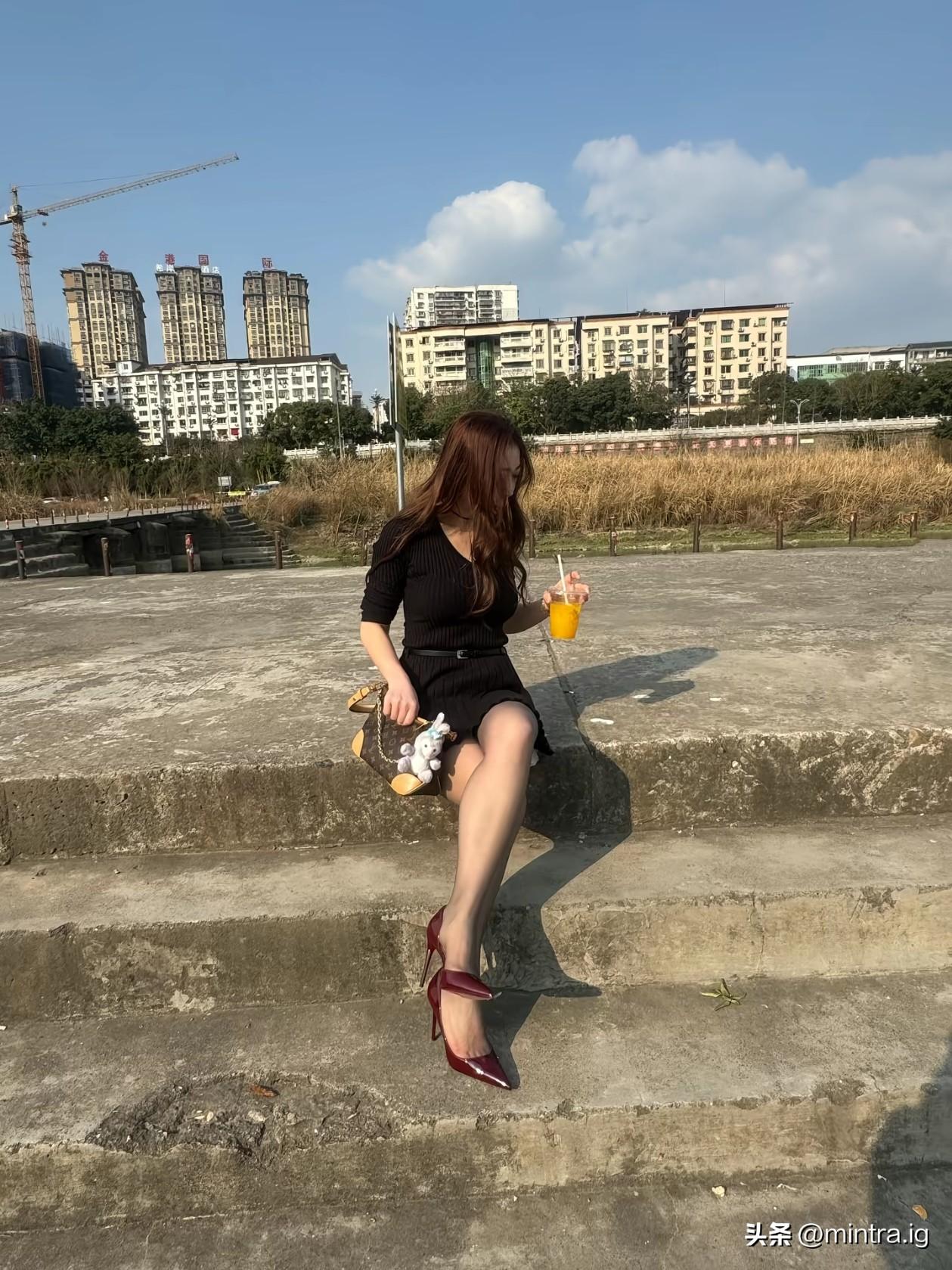 黑裙藏着温柔,红跟踩出气场,在江边的石阶上,把生活的浪漫穿在身上。