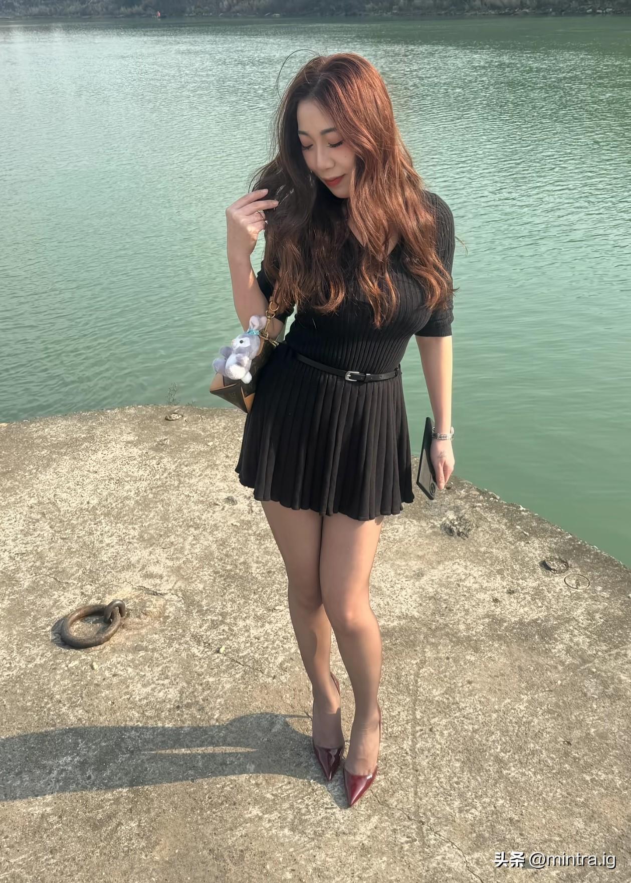 江风裹着暖阳,把日子吹得松弛又明亮。 黑裙藏着温柔,红跟踩出气场,在江边的石阶上