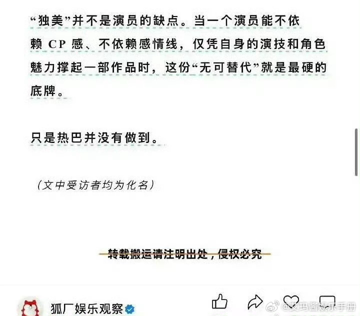 狐厂评价迪丽热巴,你觉得客观吗?独美并不是演员缺点,当一个演员能不依赖CP感、不依赖感情线,仅凭自身的演技和角色魅力撑起一部作品时,这份“无可替代”就是最硬的底牌。只是热巴并没有做到。迪丽热巴陈飞宇合作不需要破冰