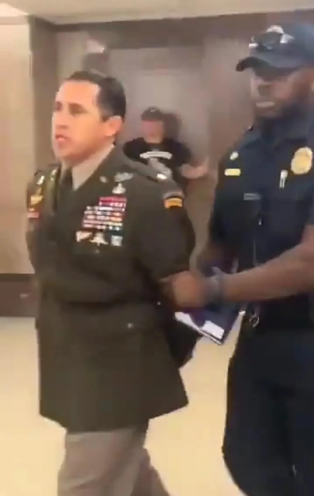美军内部公开反对这场战争的男女军人也大有人在,但他们都被戴上了手铐带走了。美军现在容不得正直军人的存在,在逆淘汰。#美国军人的无奈#