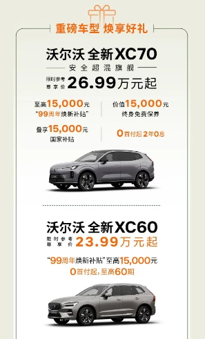 🔹全新XC70:26.99万起,至高1.5w补贴+终身免费保养+0首付2年0息