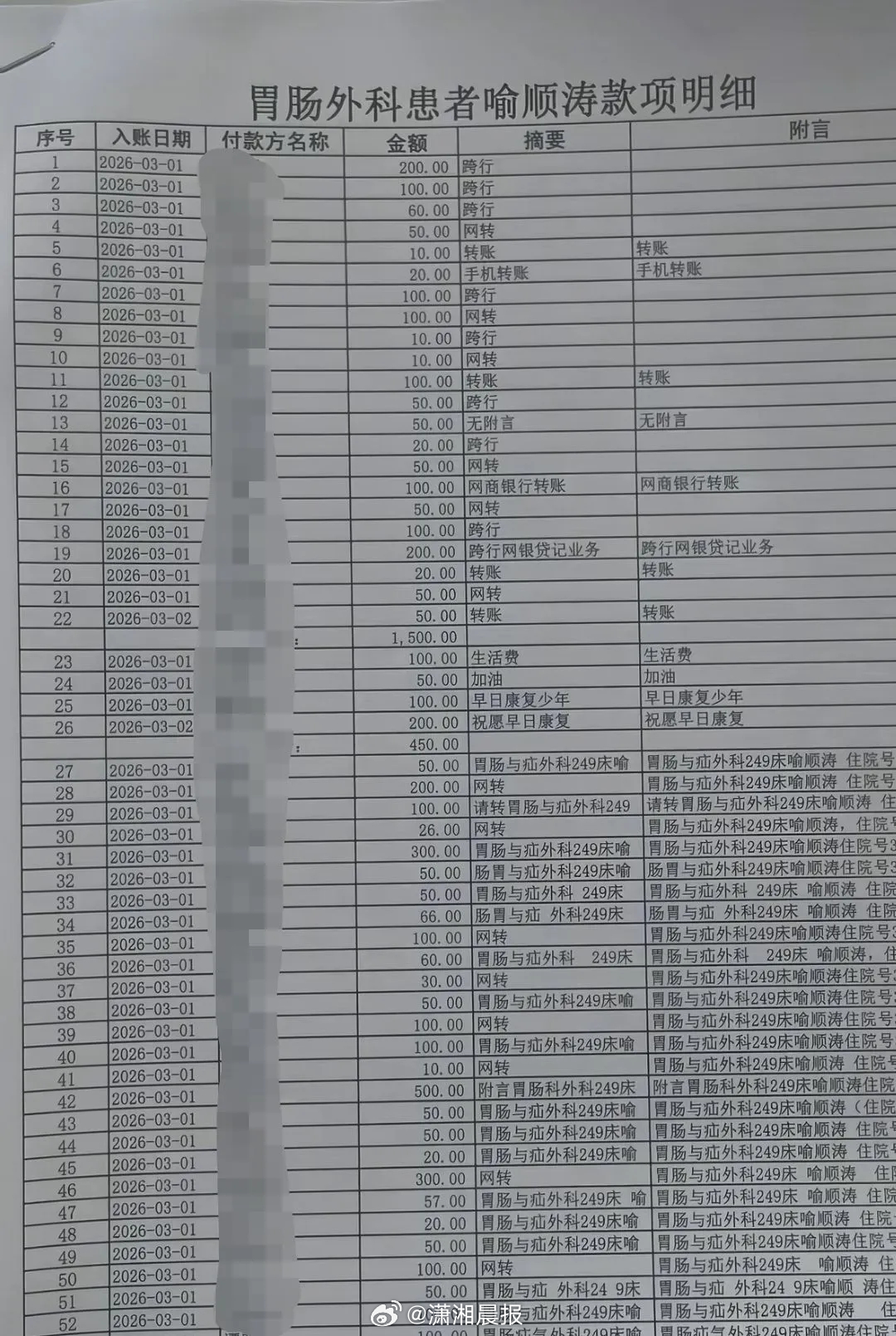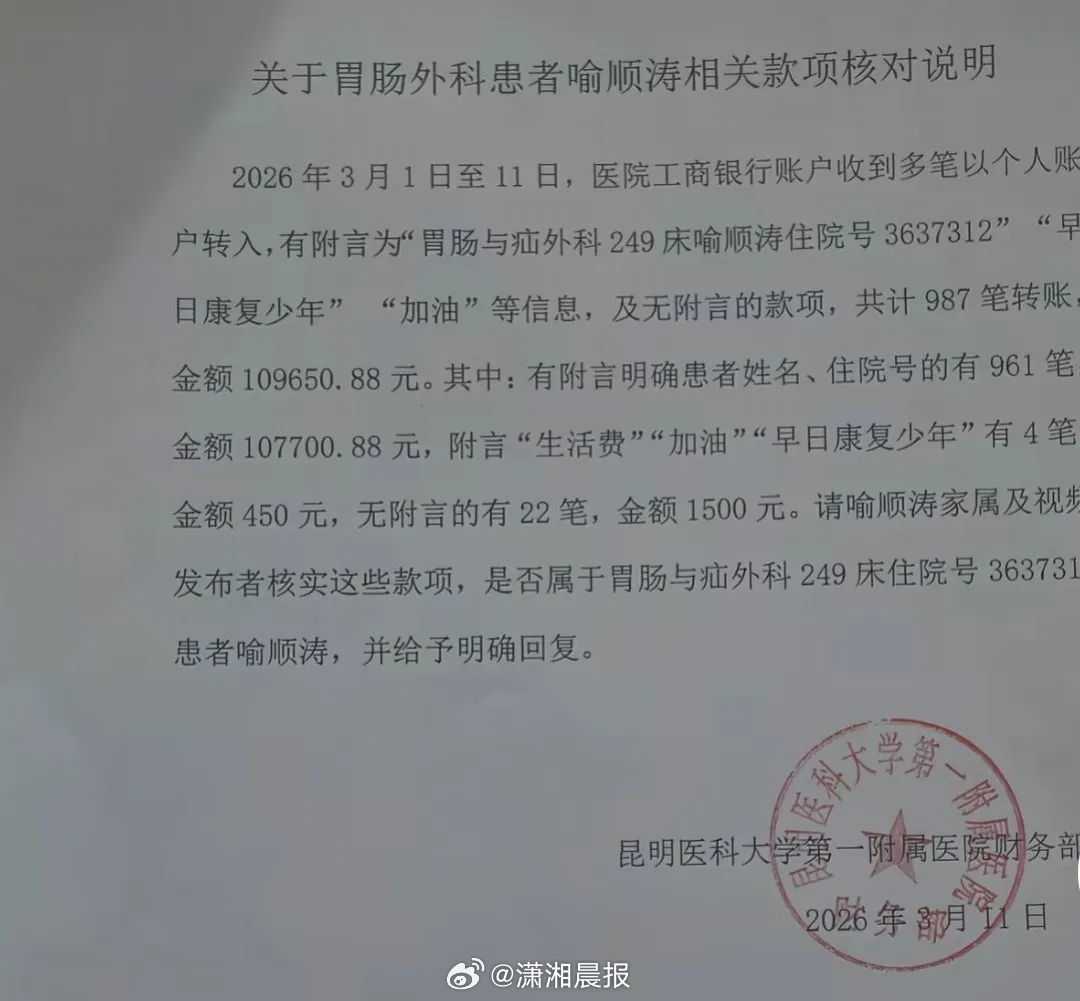 对于网友的善款,姚祥翠和医院方面十分严谨。3月11日,昆明医科大学第一附属医院财务部出具了一份款项核对说明。医院账户收到多笔以个人账户转入的款项,有的还有附言“请转肠胃与疝外科249床喻顺涛住院号3637312”“早日康复少年”“加油”等,共987笔转账,金额109650.88元。随后还附上了每个捐款好心人的名字、金额和附言等信息,满满的17页纸。