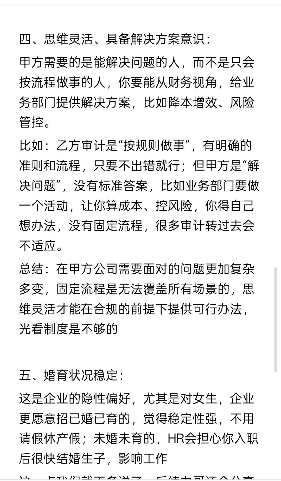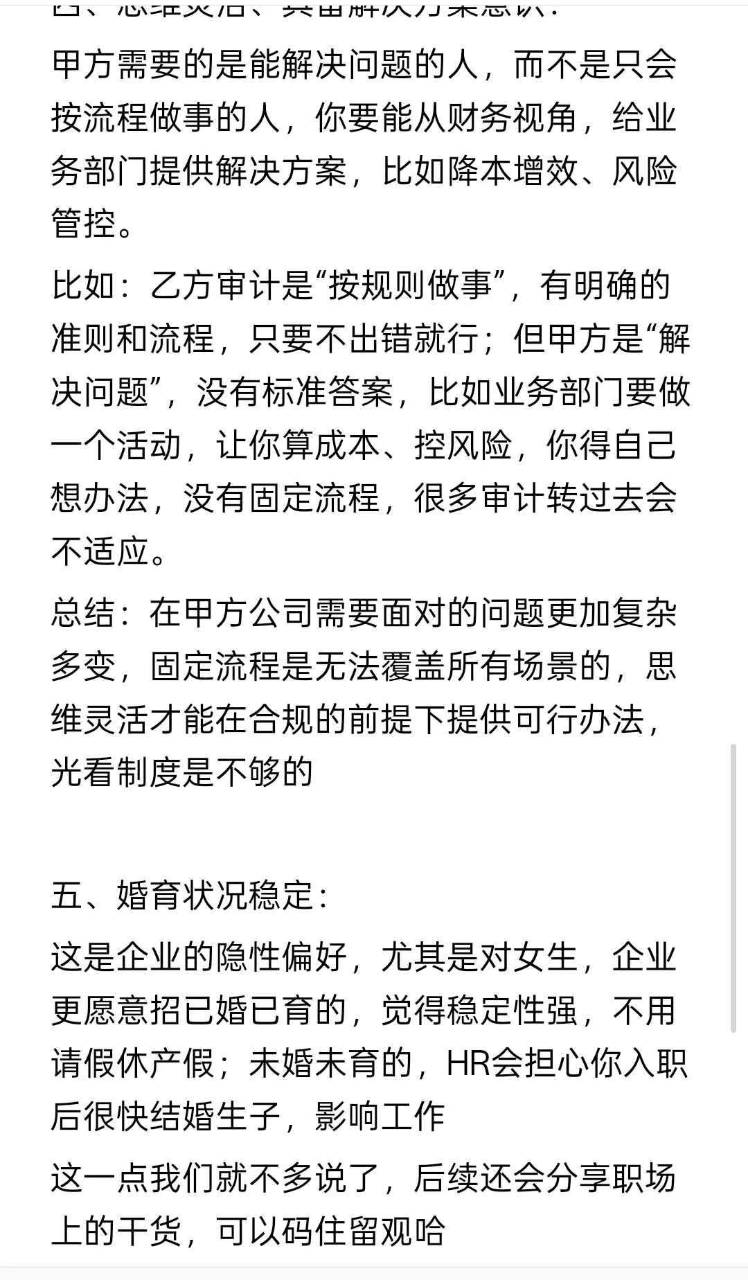 比如:乙方审计是“按规则做事”,有明确的准则和流程,只要不出错就行;但甲方是“解决问题”,没有标准答案,比如业务部门要做一个活动,让你算成本、控风险,你得自己想办法,没有固定流程,很多审计转过去会不适应。
