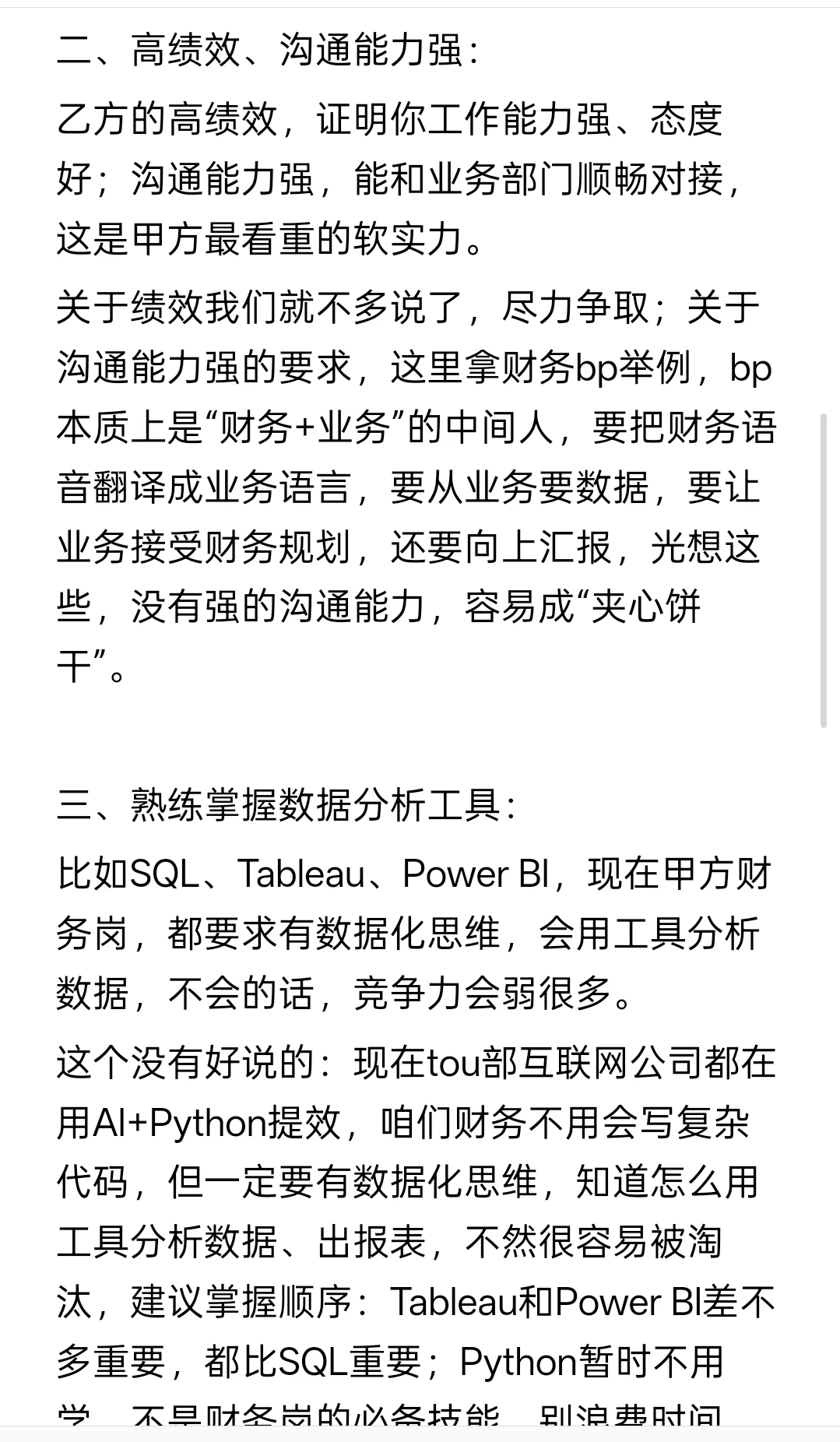 这个没有好说的:现在tou部互联网公司都在用AI+Python提效,咱们财务不用会写复杂代码,但一定要有数据化思维,知道怎么用工具分析数据、出报表,不然很容易被淘汰,建议掌握顺序:Tableau和Power BI差不多重要,都比SQL重要;Python暂时不用学,不是财务岗的必备技能,别浪费时间。